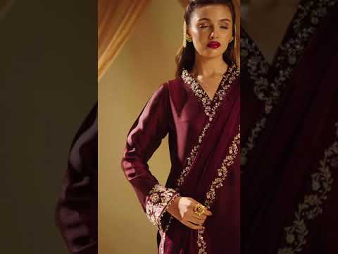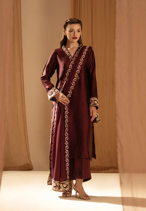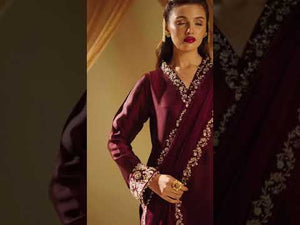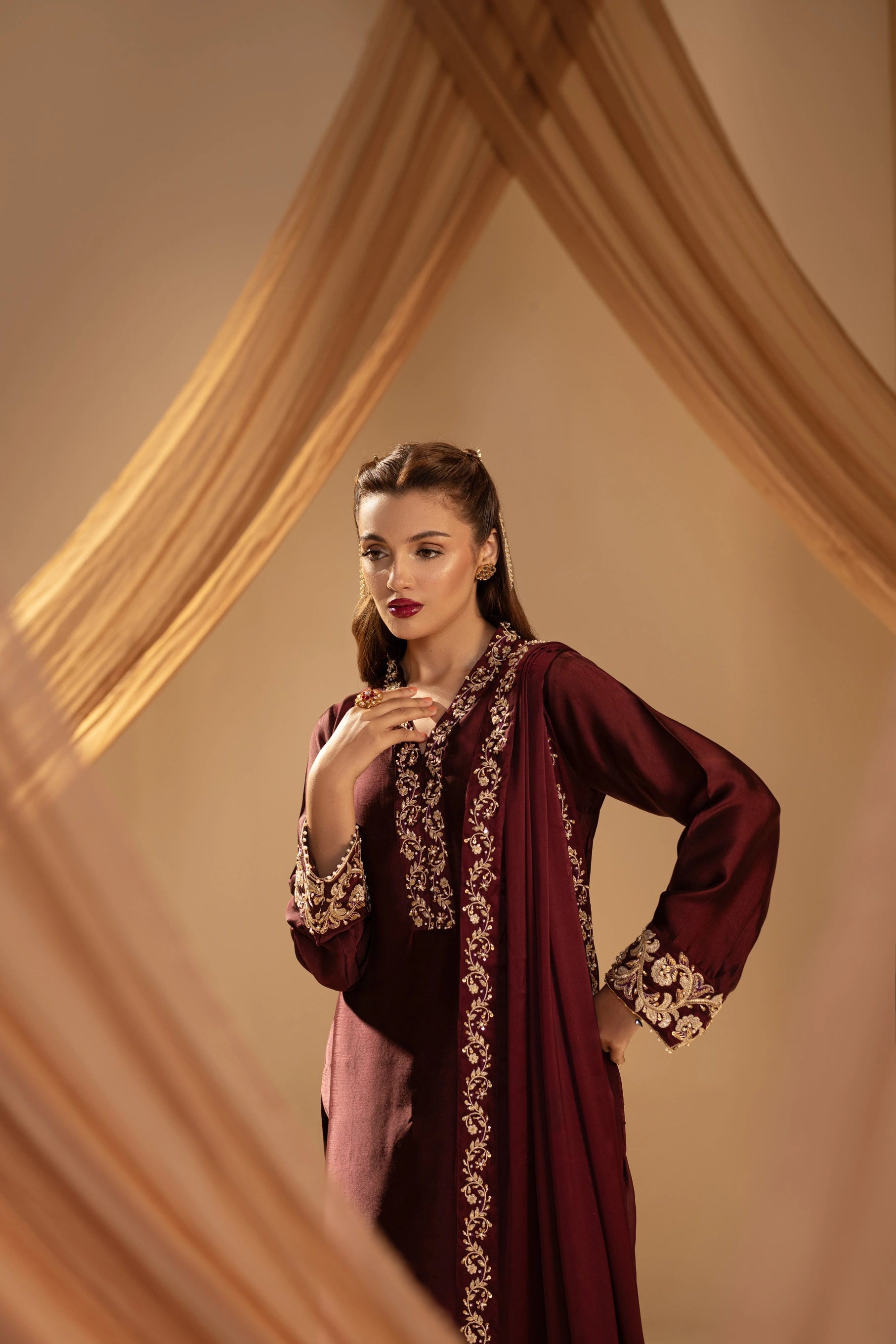 A luxurious three-piece ensemble in a rich mehroon hue, featuring a tassel silk shirt adorned with intricate machine-embroidered patches and delicate hand embroidery. Paired with sleek tassel silk pants and a lightweight chiffon silk dupatta, this outfit exudes sophistication and grace, making it ideal for festive celebrations, weddings, or evening gatherings.