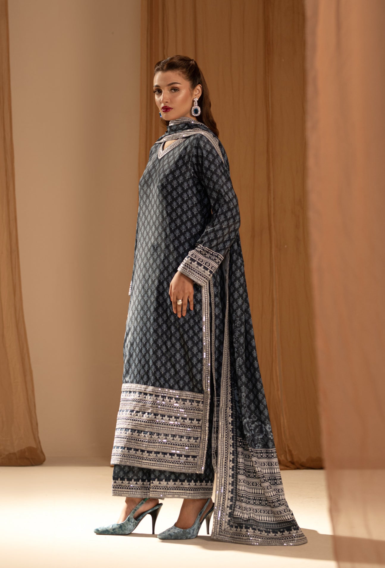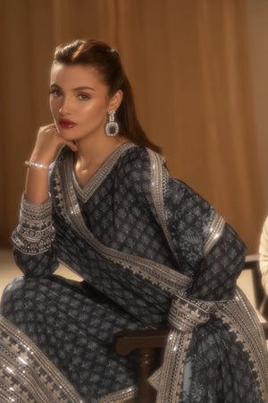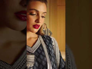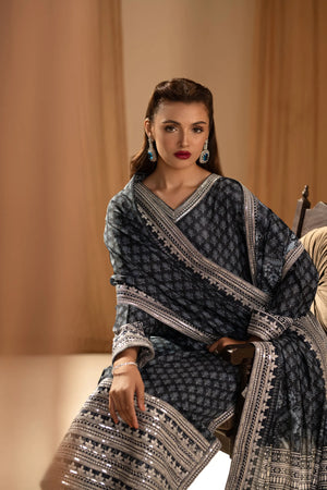 An Elegant printed blue silk suit, blending contemporary design with intricate craftsmanship. Made from soft, luxurious silk, the suit features machine-embroidered organza patches, delicate threadwork, shimmering sequins, and tilla embroidery for added texture and depth. Ideal for festive occasions, semi-formal events, or day-to-night celebrations.