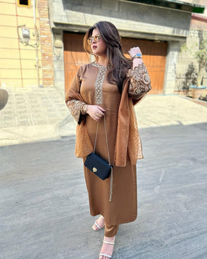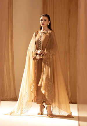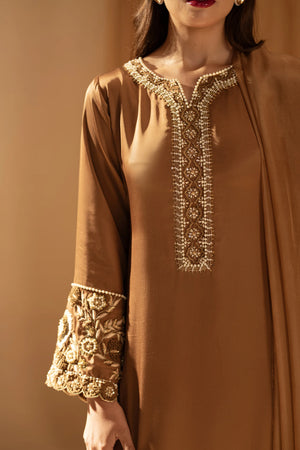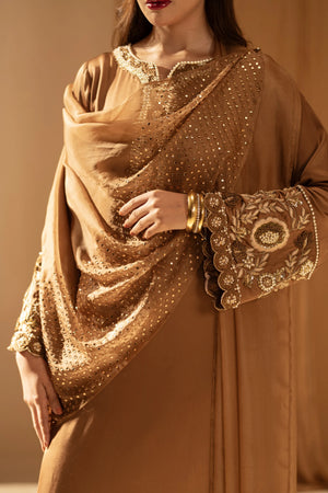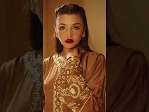 Step into timeless elegance with our golden pure silk suit, featuring exquisite hand embroidery with cora dabka work, silk threads, shimmering sitara, and delicate pearls. The sleeves are enhanced with stunning cutwork for added sophistication. Paired with a soft organza dupatta, embellished with shining stones. Perfect for weddings, festive occasions, or glamorous evening events.