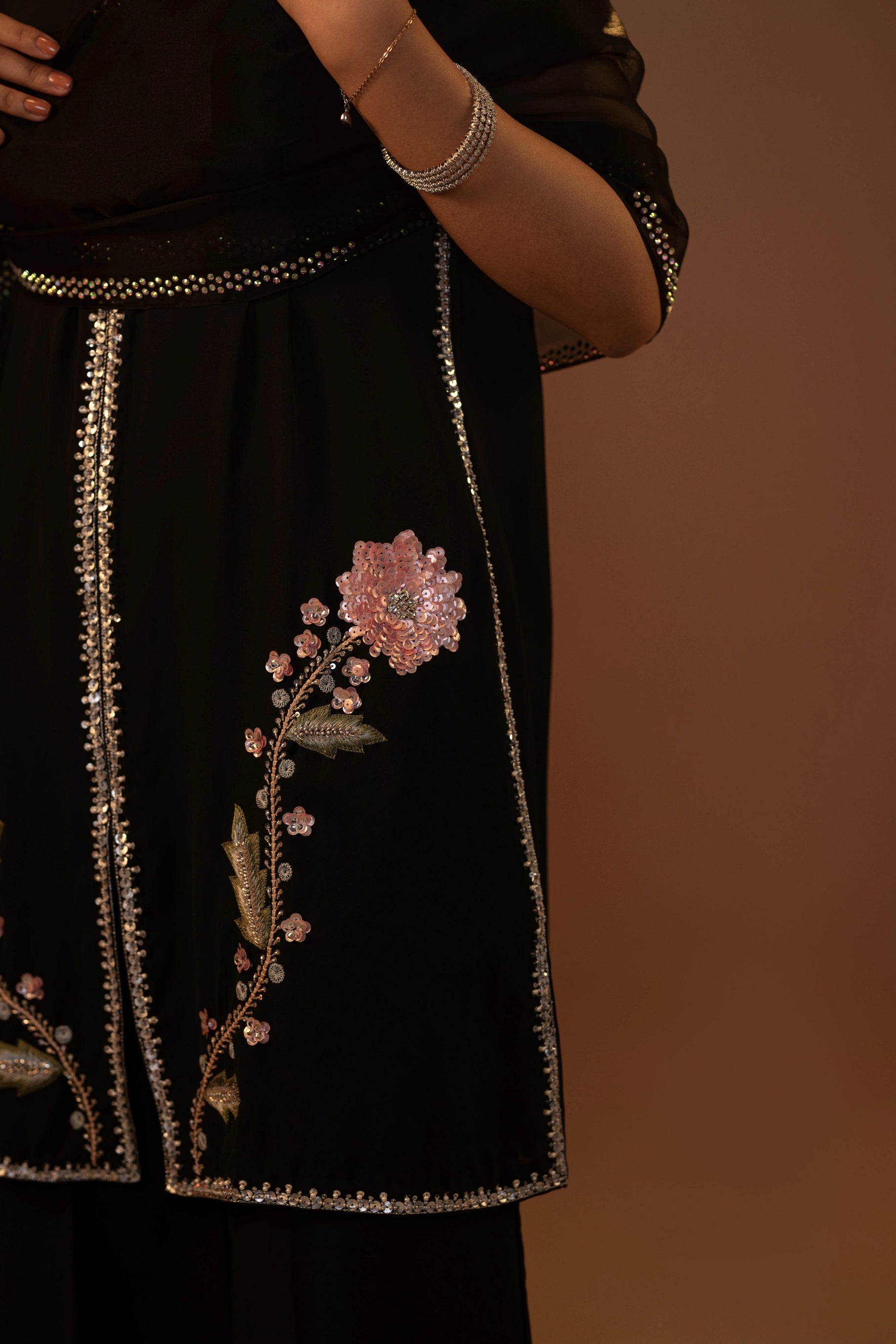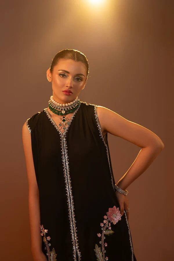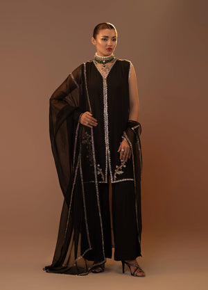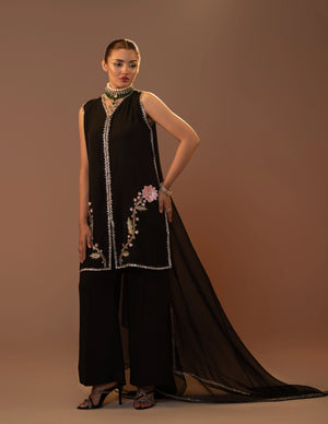 Unveil the magic of timeless fashion with our black pure georgette suit, adorned with multi-light-colored threadwork and shimmering sequins. The intricate detailing creates a vibrant interplay of colors and sparkle. Paired with a delicate organza dupatta featuring a rhinestone-embellished border. Perfect for festive occasions, evening soirées, or formal celebrations.