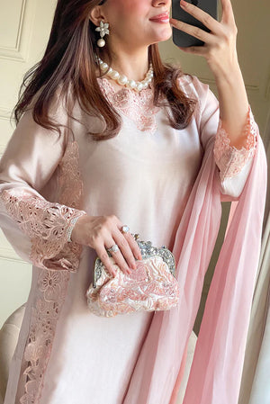 Discover timeless charm with our elegant tassel silk suit, featuring a beautifully designed tassel silk shirt with intricate floral embroidery. Paired with raw silk pants and a lightweight medium silk dupatta, this ensemble exudes grace and sophistication, perfect for formal occasions or festive gatherings.