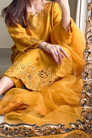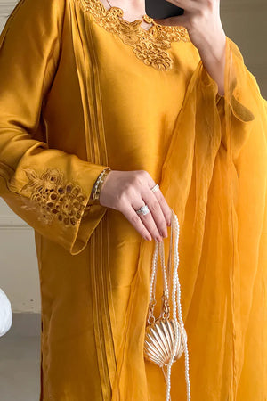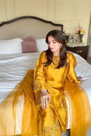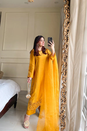 Discover timeless charm with our elegant tassel silk suit, featuring a beautifully designed tassel silk shirt with intricate floral embroidery. Paired with raw silk pants and a lightweight medium silk dupatta, this ensemble exudes grace and sophistication, perfect for formal occasions or festive gatherings.