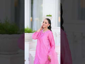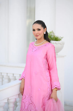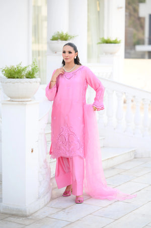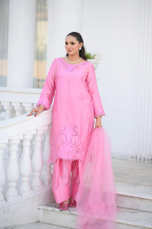 Delicate, dreamy, and effortlessly refined. This blush Barbie pink elegant ensemble features a beautifully embroidered pure Sheesha silk short shirt paired with a farshi shalwar. The look is elevated with a lightweight pure organza dupatta, adding just the right touch of airy sophistication. The outfit blooms in blush pink—fresh, romantic, and perfect for daytime occasions and festive affairs.