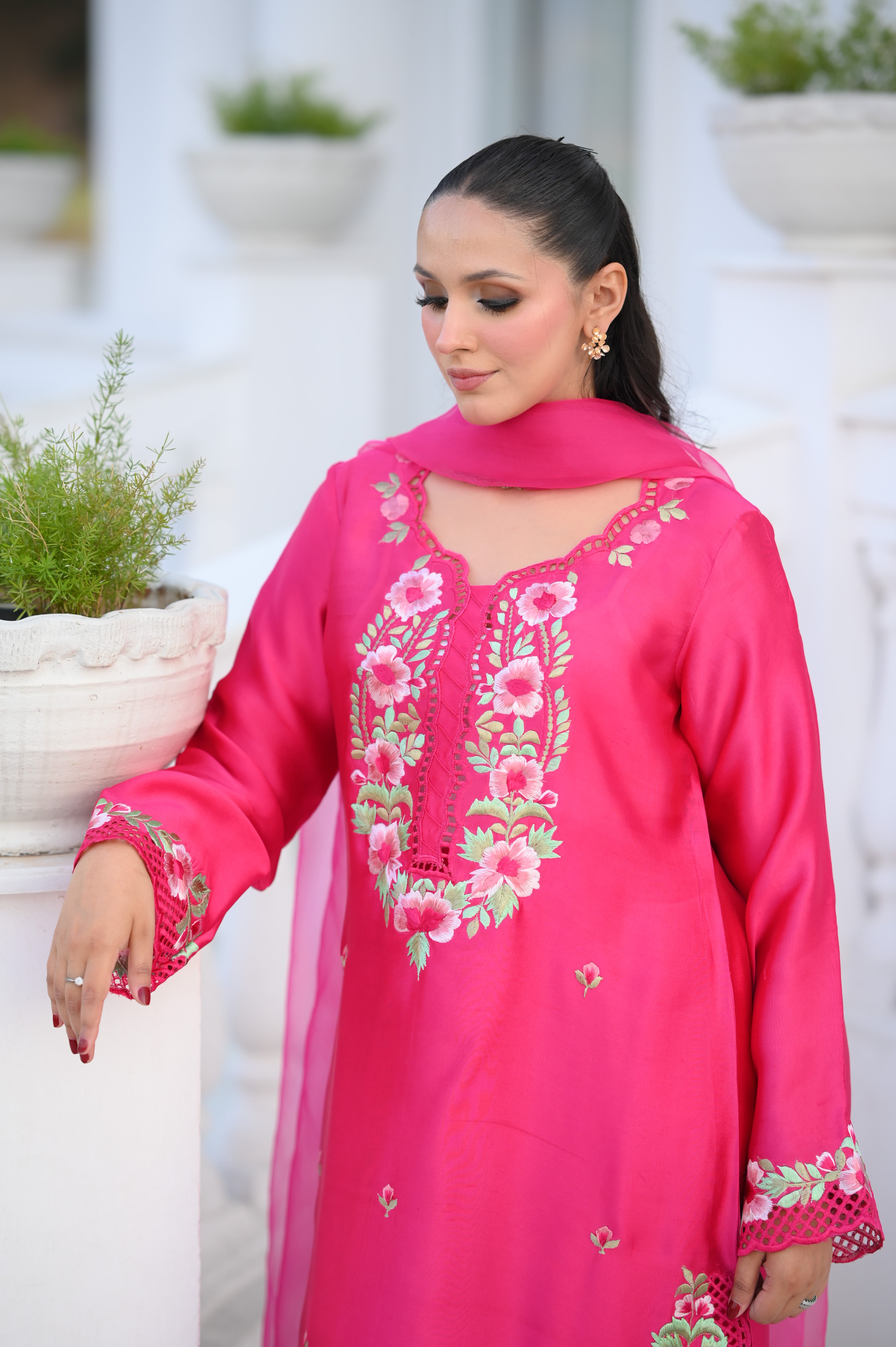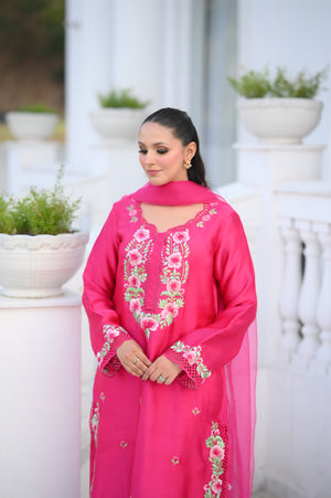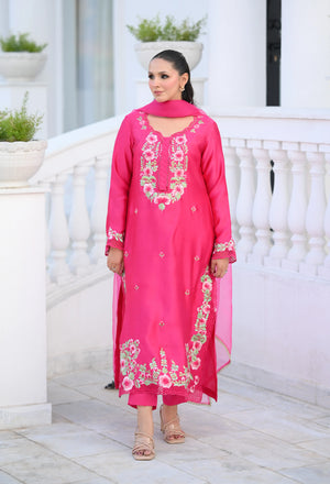 Graceful and effortlessly elevated, this shocking pink Sheesha silk ensemble is designed for those who appreciate timeless details with a modern edge. This luxury pret outfit features a beautifully embroidered drop-length shirt, offering a flattering elongated silhouette that flows with poise. Paired with straight silk pants and finished with a delicate pure organza dupatta, it adds an airy elegance to the look. Draped in bold tones, this ensemble strikes the perfect balance between comfort and statement-making style—ideal for refined daywear and elegant evening affairs.