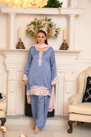 Understated yet effortlessly refined, the Cornflower dress captures the essence of modern grace. Featuring a straight-cut short shirt in luxurious Rayyan silk, adorned with delicate pink embroidered applique, it is paired with a classic farshi shalwar for timeless elegance. The soft, contrasting medium silk dupatta adds a light, airy feel to the ensemble, completing the look with subtle sophistication. Designed for comfort without compromising on style, Cornflower is perfect for graceful daywear or understated celebrations.