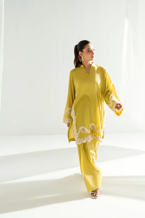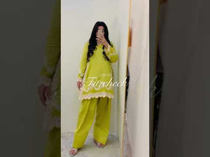 This soft lime silhouette falls gracefully, offering a flattering fit for all body types. The shirt is adorned with delicate hand embroidery along the hem, side panels, and sleeves—blending traditional artistry with a modern cut for an effortlessly refined look.