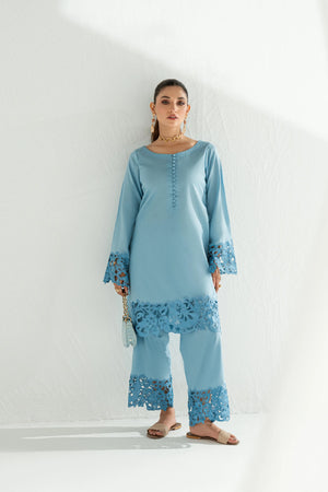 This ensemble offers effortless comfort without compromising on style. The highlight of this look is the intricate cutwork embroidery, adding a touch of finesse and elegance to the overall design.