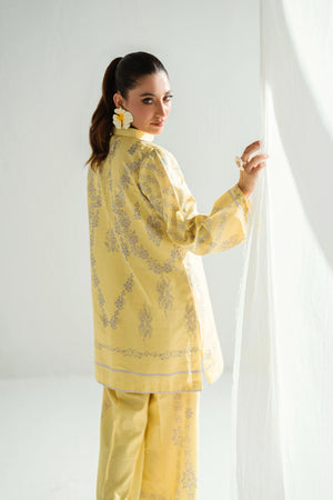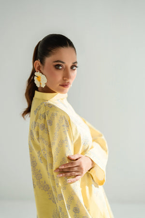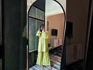 Step into summer elegance with this radiant pastel yellow ensemble, delicately adorned with soft silver-grey ornaments. The relaxed silhouette of the kurta brings ease and flow, while the straight printed trousers add a subtle contrast—offering timeless sophistication without sacrificing comfort.