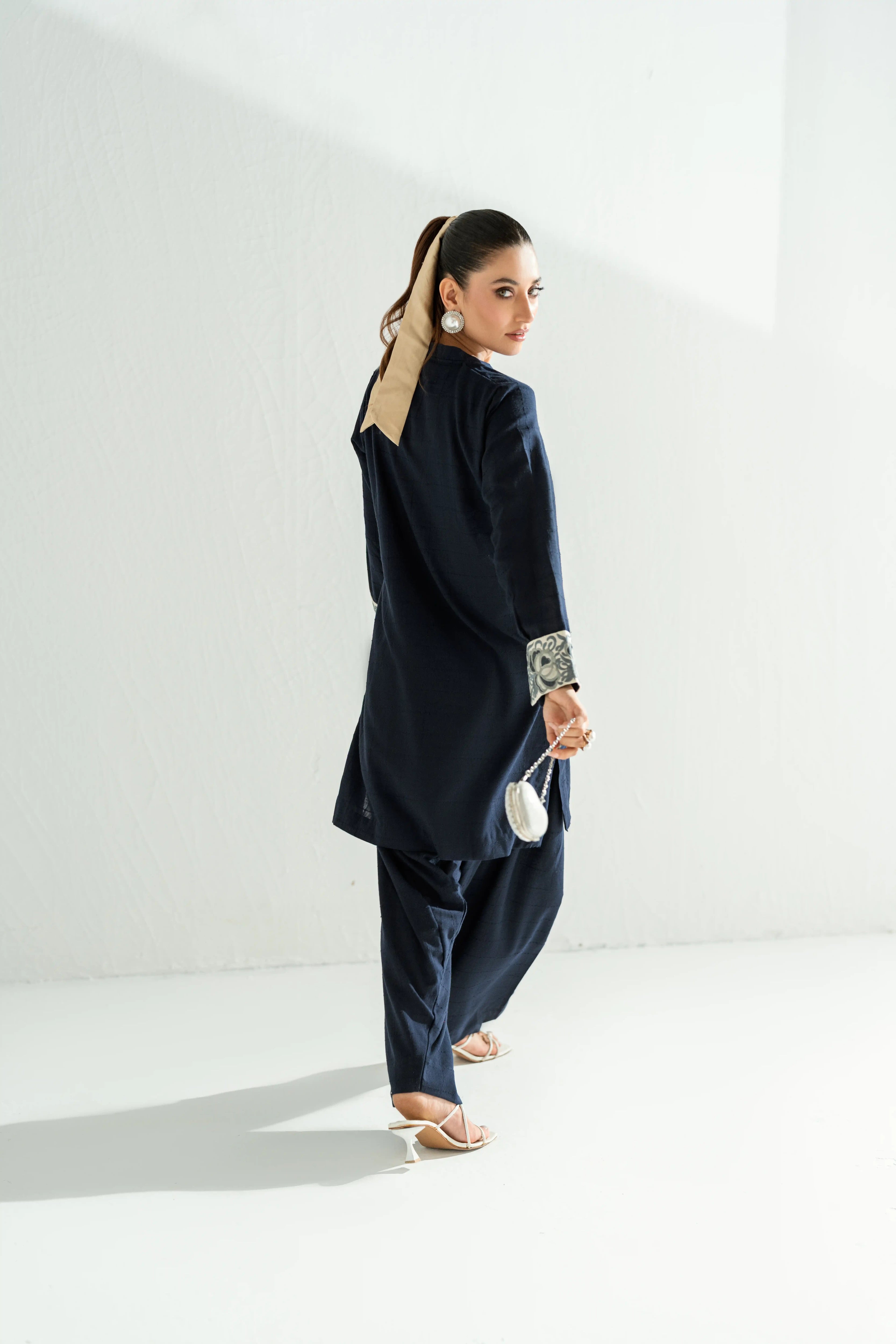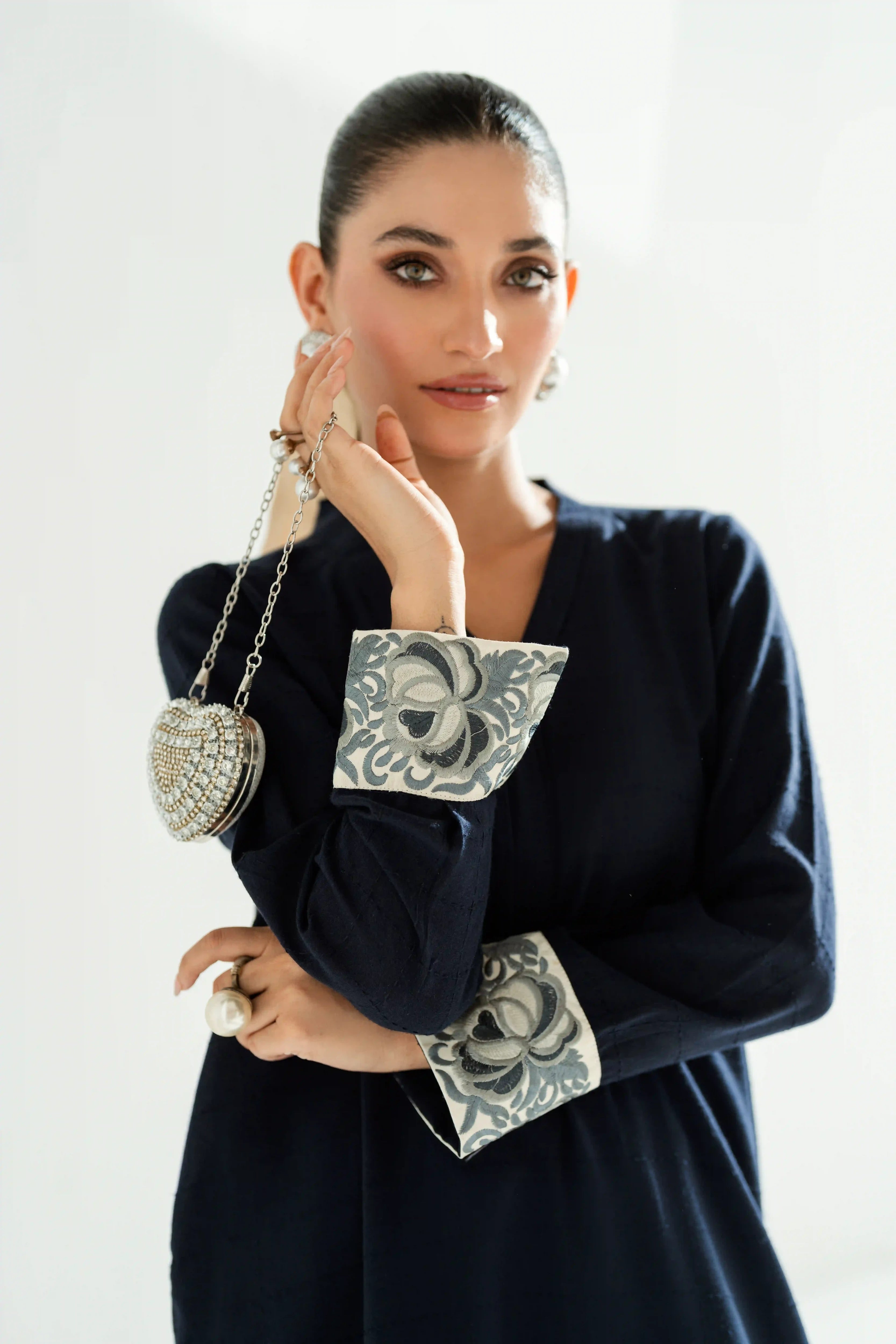 This ensemble features a striking blue tone that radiates calm and sophistication. The highlight of the design lies in its delicately embroidered cuffs, showcasing intricate threadwork that adds a graceful and feminine touch to the overall look.