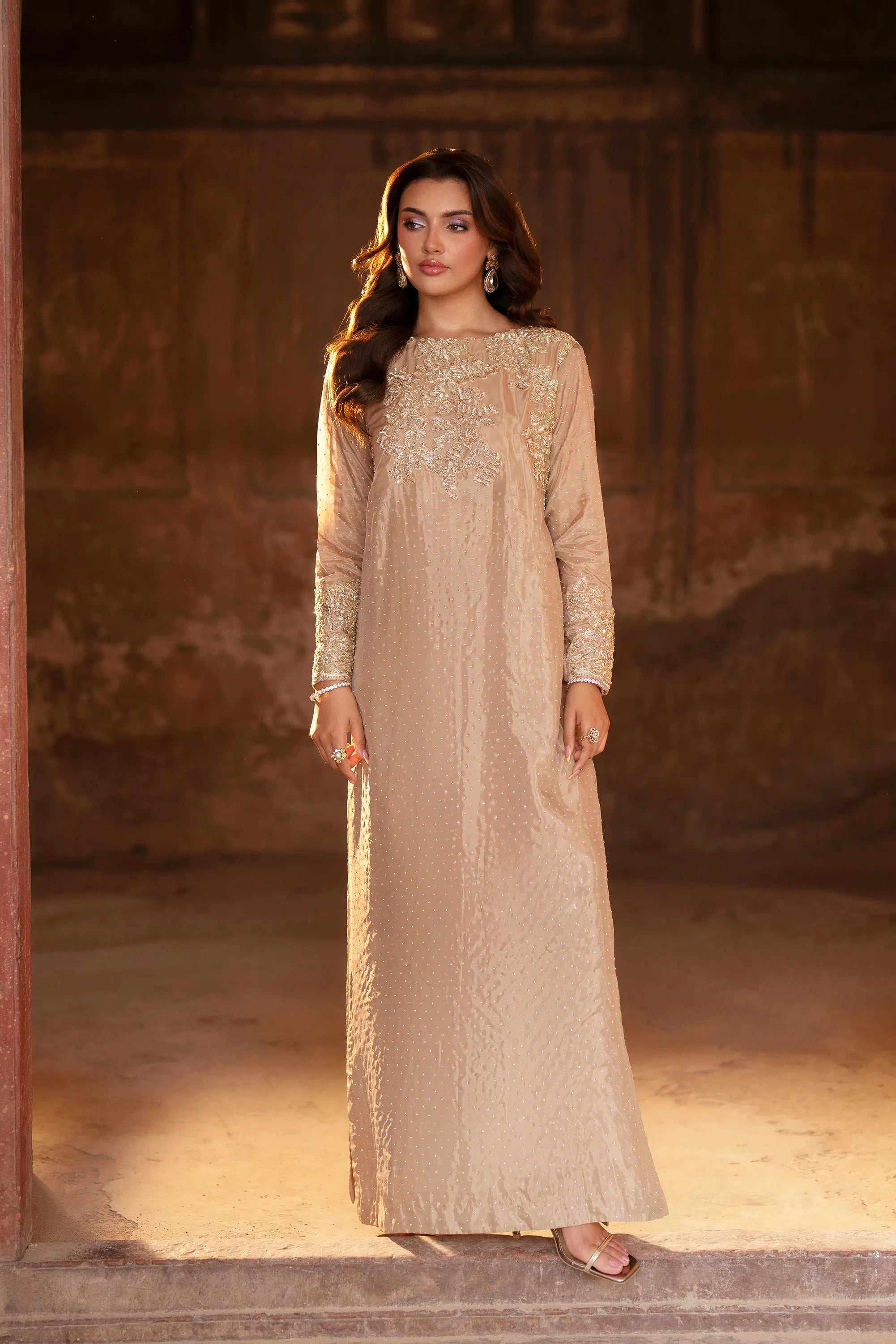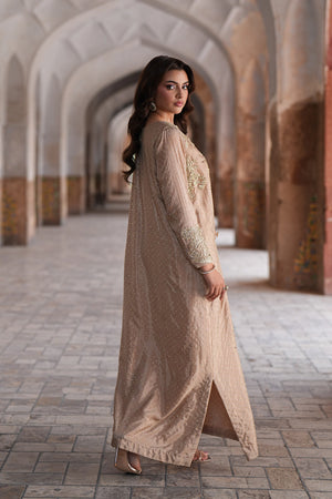 A vision of timeless elegance, this champagne gold kaftan radiates refined sophistication and grace. Designed in a long straight silhouette, the ensemble captures the essence of regal femininity, making it an exquisite choice for formal occasions and festive gatherings.