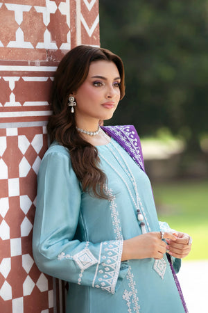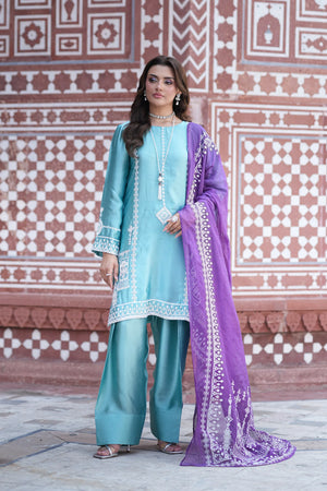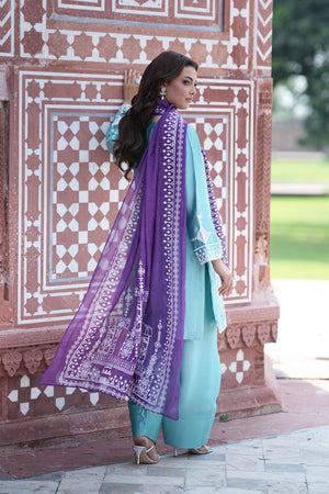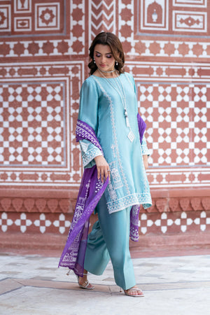 Crafted from a luxurious smooth blue Shesha silk, this elegant outfit is designed to embody refined sophistication with a timeless cultural essence. The shirt features a straight-cut silhouette, enhanced with delicate screen-printed motifs along the neckline, side panels, sleeves, and hem. These intricate patterns, inspired by classic ethnic artistry, add depth and character to the attire while maintaining its modern grace.