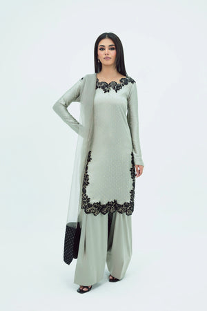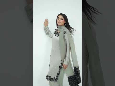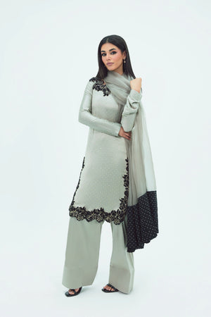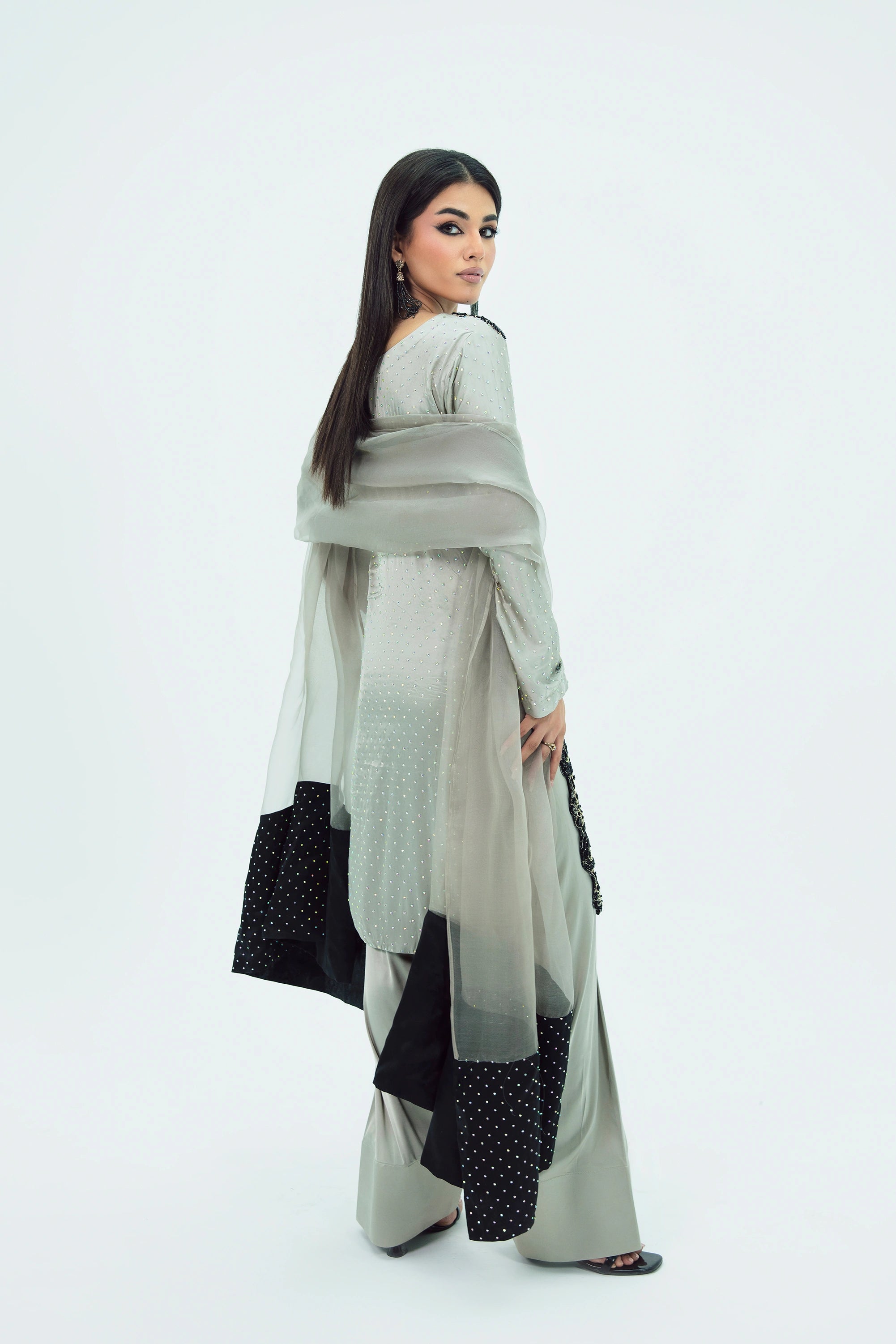 The outfit is paired with a matching farshi shalwar, creating a flowy silhouette that enhances the straight shirt’s graceful fall. A lightweight grey organza dupatta finished with black detailing completes the look, tying the ensemble together with harmony and sophistication.