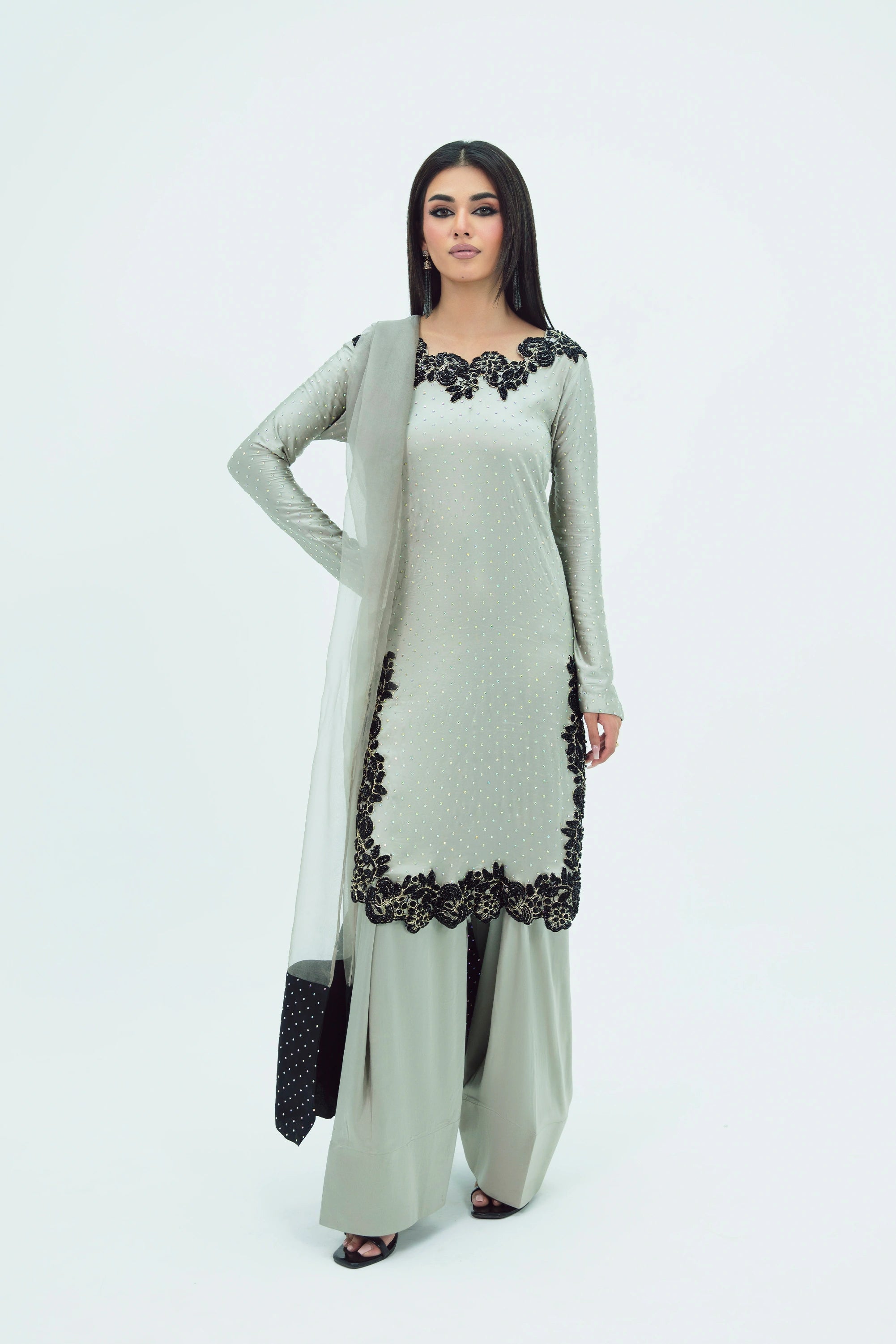 This graceful ensemble is crafted in a soft silver-grey tone, beautifully contrasted with intricate black floral embroidery along the neckline, side panels, and hem. The embroidery is delicately designed with scalloped patterns, sequins, and beadwork, adding a refined shimmer to the outfit. Simple sleeves balance the detailed embellishments, keeping the look timeless and elegant.