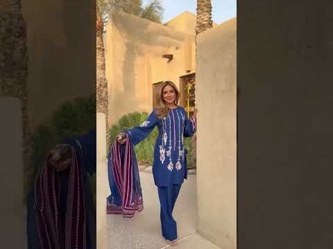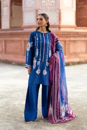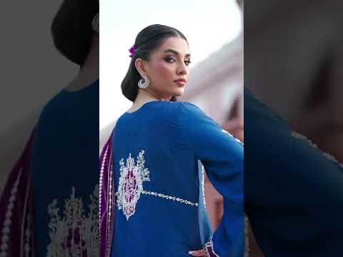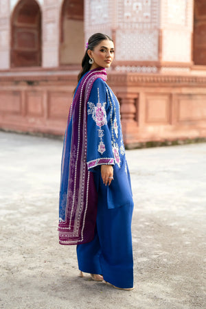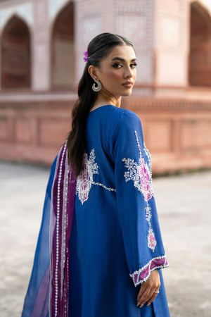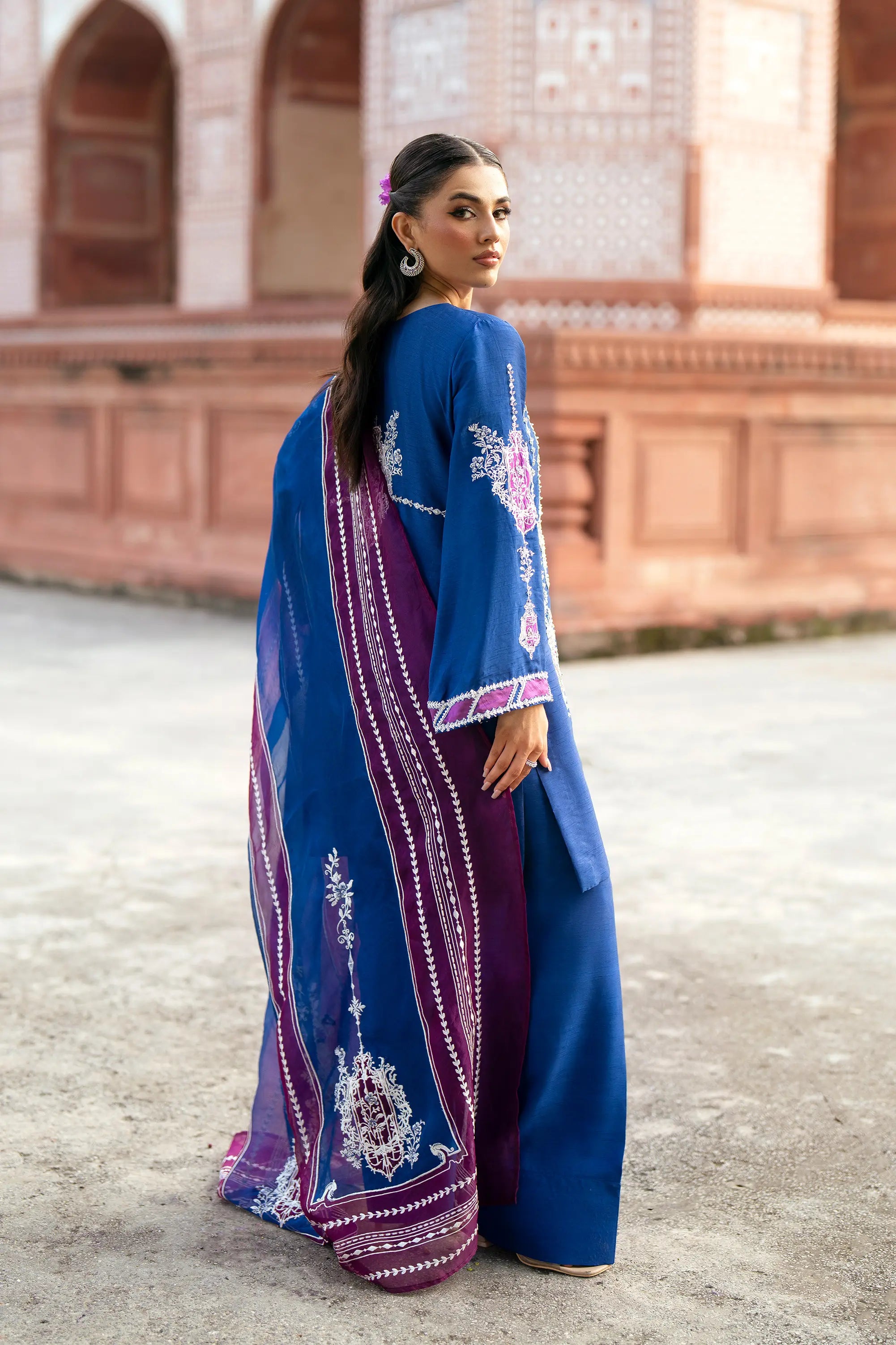Paired with a matching wide-leg royal blue farshi shalwar, the outfit strikes the perfect balance between modern grace and traditional allure. The look is elevated with a two-toned dupatta in plum and blue, crafted from luxurious pure kathan organza. Adorned with embroidered borders and motifs, its sheer texture drapes elegantly, completing the ensemble with flow and refinement.