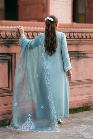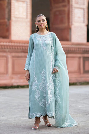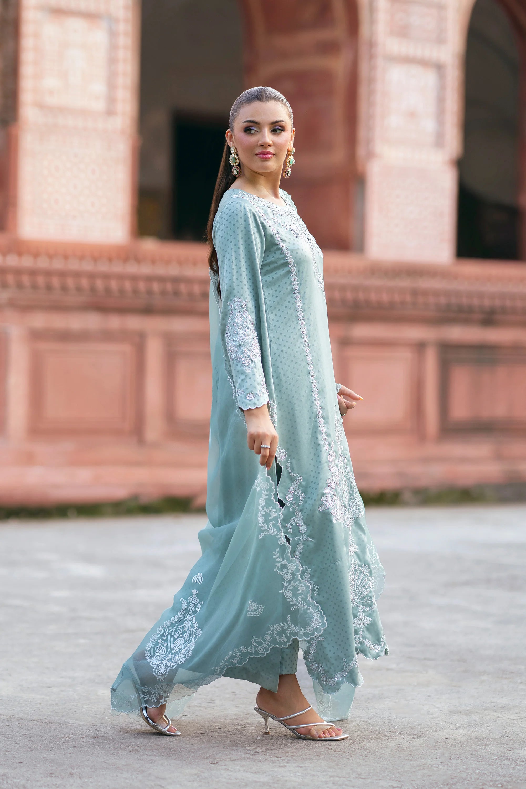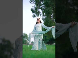 The refreshing sage green tone makes it versatile for both daytime festivities and evening occasions, offering a subtle yet sophisticated appeal. Paired with a pure Kathan organza dupatta, airy and elegant with a sheer finish, the ensemble strikes the perfect balance between tradition and modern refinement.