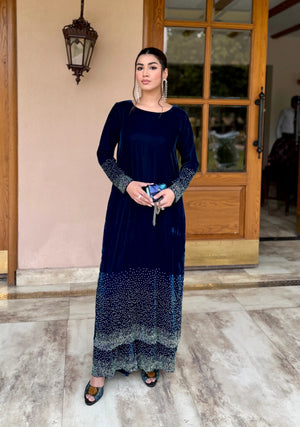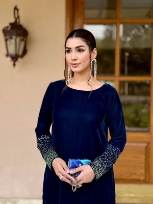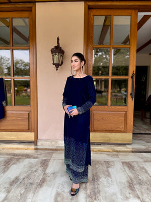 This ensemble features a long straight cut velvet shirt in a rich royal blue hue,exuding luxury and grace. The shirt is adorned with intricate rhinestone work in a gradient pattern that start front hem and cuffs,transitioning from silver tones giving a sparkling effect.The embellishments add texture and depth creating a sophisticated shimmer under light.The sleeves are full length with heavily embellished and fabric to stand out.Paired with matching velvet straight trouser also detailed with rhinestone work along the hemline to coordinate perfectly with the shirt.