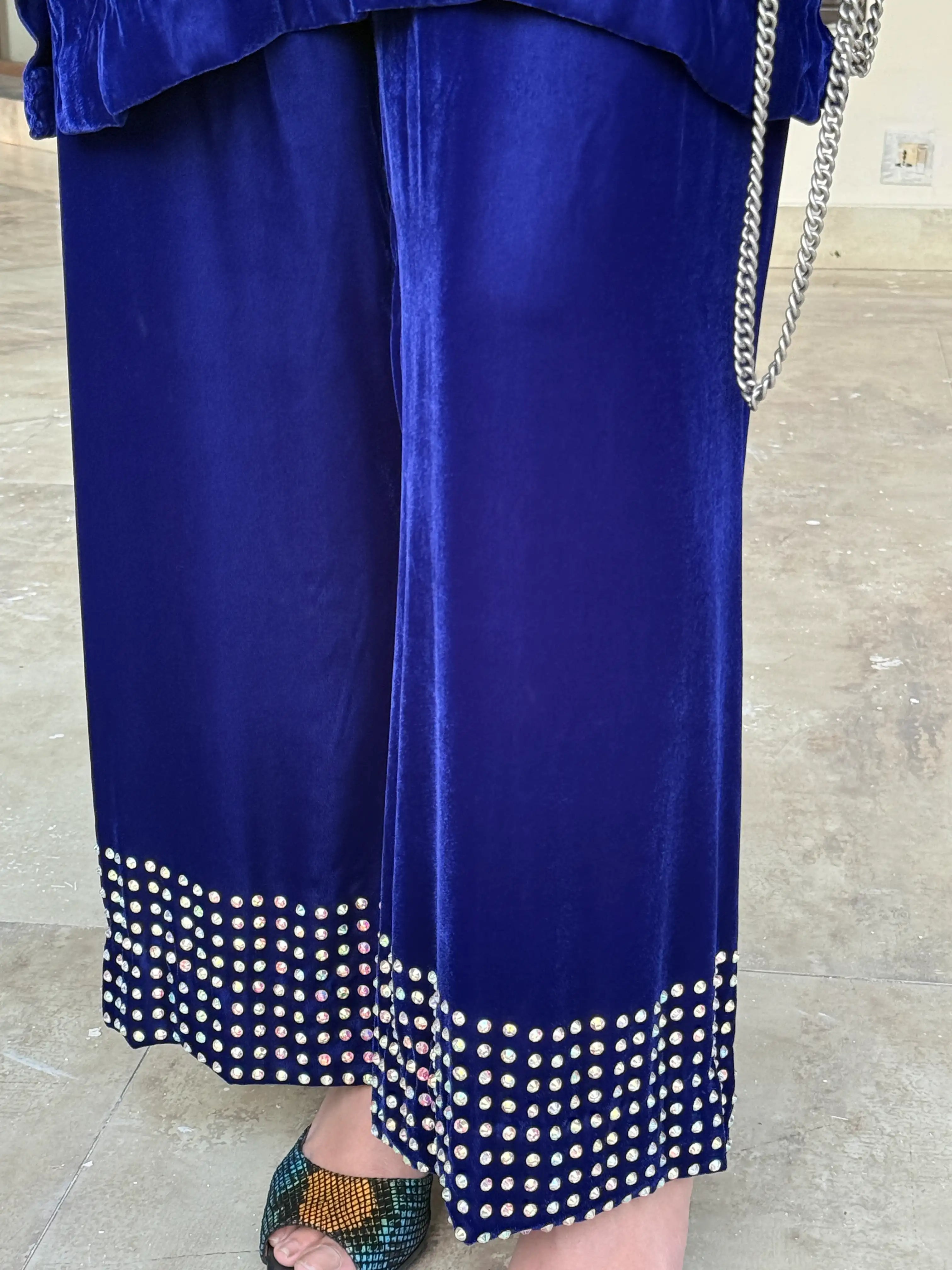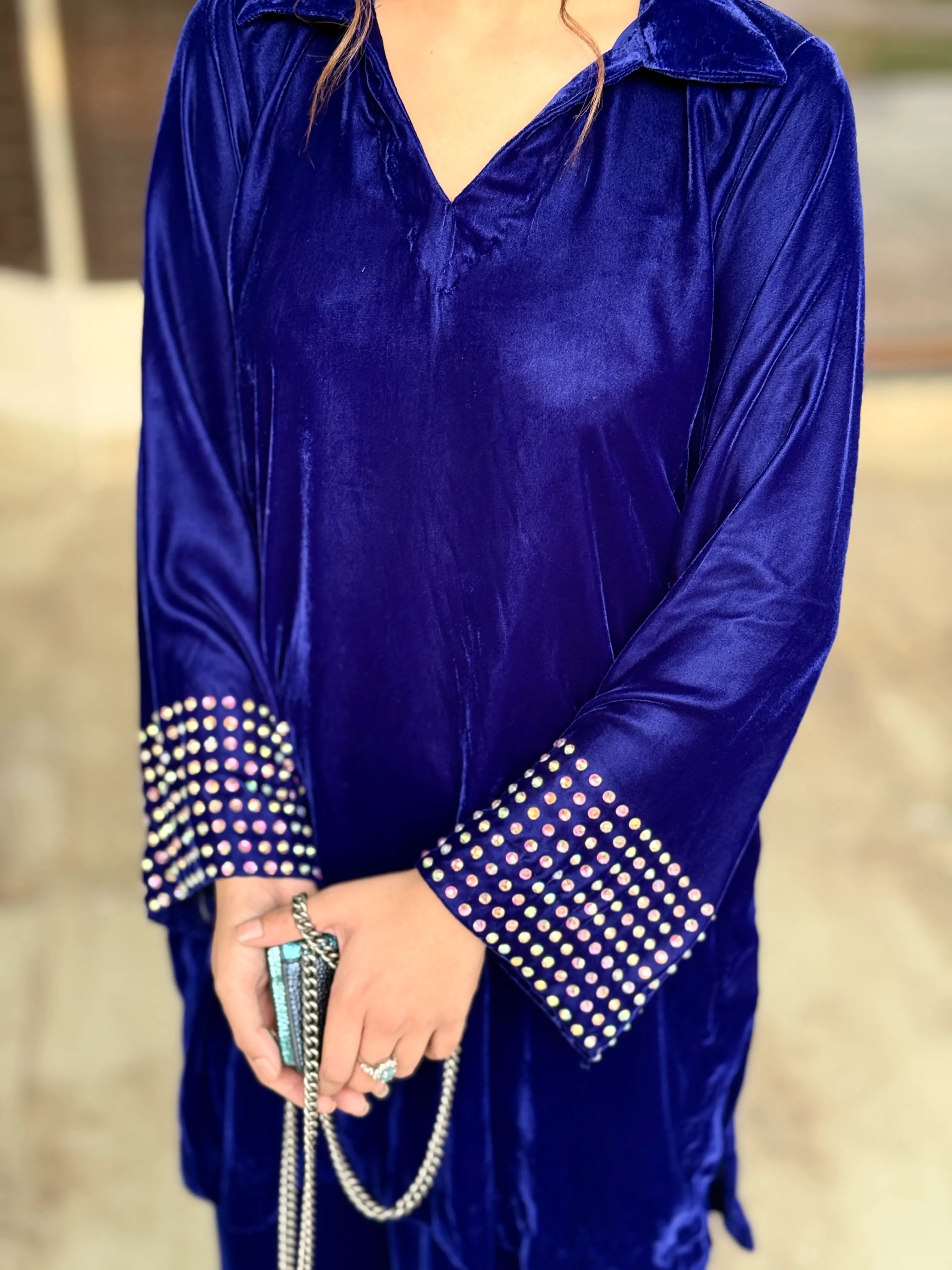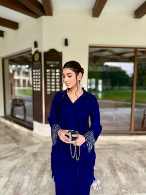 This elegant royal blue velvet dress exudes luxury and sophistication,perfect for formal or festive occasions.The outfit is crafted from rich velvet fabric that gived it a regal and graceful appearance.The shirt features a classic collar neckline,adding a touch of style to the traditional silhouette.The sleeves are beautifully adorned with sparkling rhinestone work creating a refined shimmer with every moment .Matching rhinestone embellishment on the trouser adds a glamourous finish tho the entire ensemble.