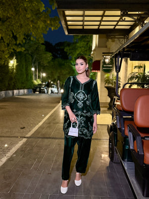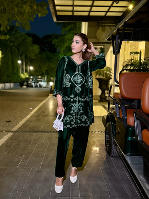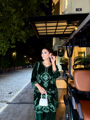Deep emerald green a classic and regal shade that enhance the overall opulent look. Rich velvet material giving a royal and graceful appearance perfect for evening or festive wear.The dress features intricate embroidery in a lighter green thread, arranged in symmetrical floral and geometric motifs across the front sleeves and hemline.The embroidery adds texture and highlights the velvet's shine beautifully .A V -shaped neckline bordered with delicate embroidery that complements the design.Matching velvet trouser that maintain a coordinated and graceful look