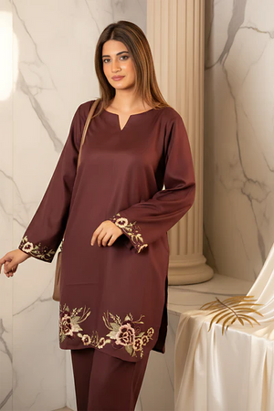 This elegant co-ord set is crafted from premium dark brown karandi fabric known for its soft texture and warm winter friendly feel.The outfit features a straight trouser paired with a beautifully detailed top that adds a touch of sophistication.Designed with delicate floral embriodery placed gracefully around the round hemline adding a feminine and refined touch.Comfortable loose fit silhouette perfect for casual wear or semi formal gatherings