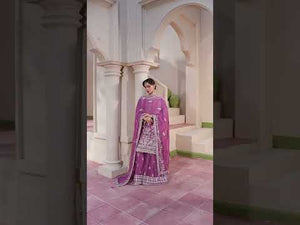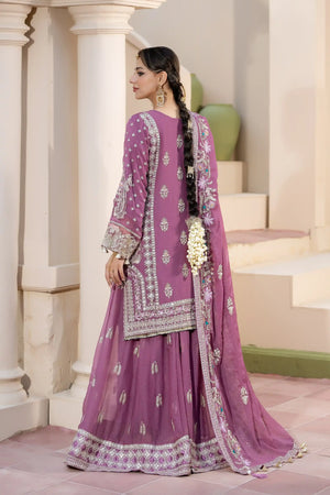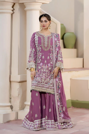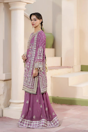 Draped in charm, this embroidered chiffon shirt showcases delicate hand-embellished adda work on the neckline. The embroidered chiffon sleeves exude grace, paired with a finely embroidered chiffon dupatta. Finished with an embroidered chiffon sharara adorned with an embroidered silk border for a luxurious, classic look.