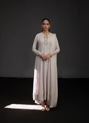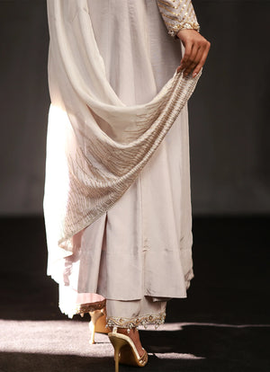 The Silver Lunar Set is a vision of elegance, crafted in lustrous tussle silk. This graceful kalidaar frock is adorned with beautiful hand embroidery on the neckline and sleeves, paired with culottes detailed with adda work. The medium silk dupatta glistens with stone work, completing the look. A sophisticated three piece ensemble that radiates timeless charm.