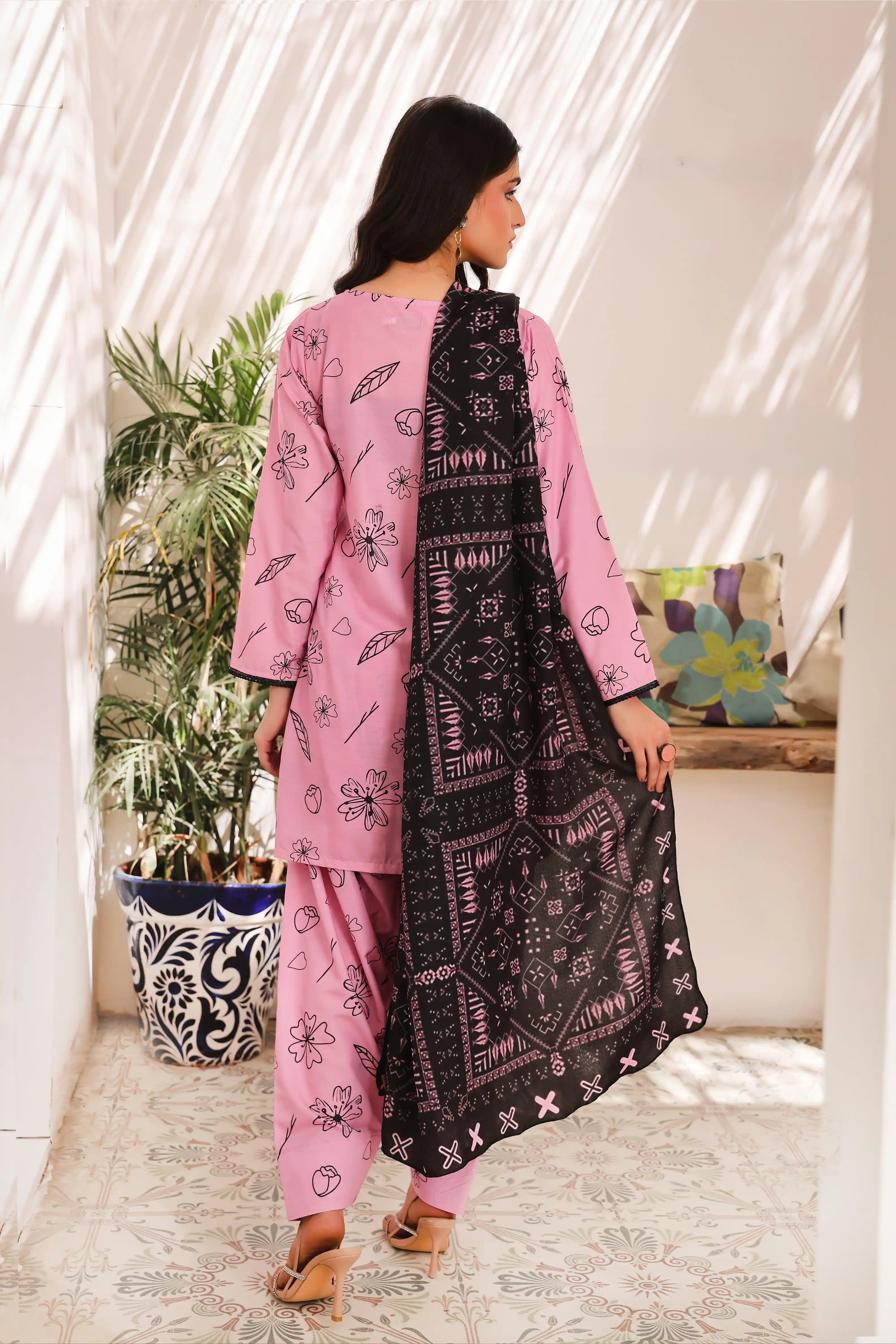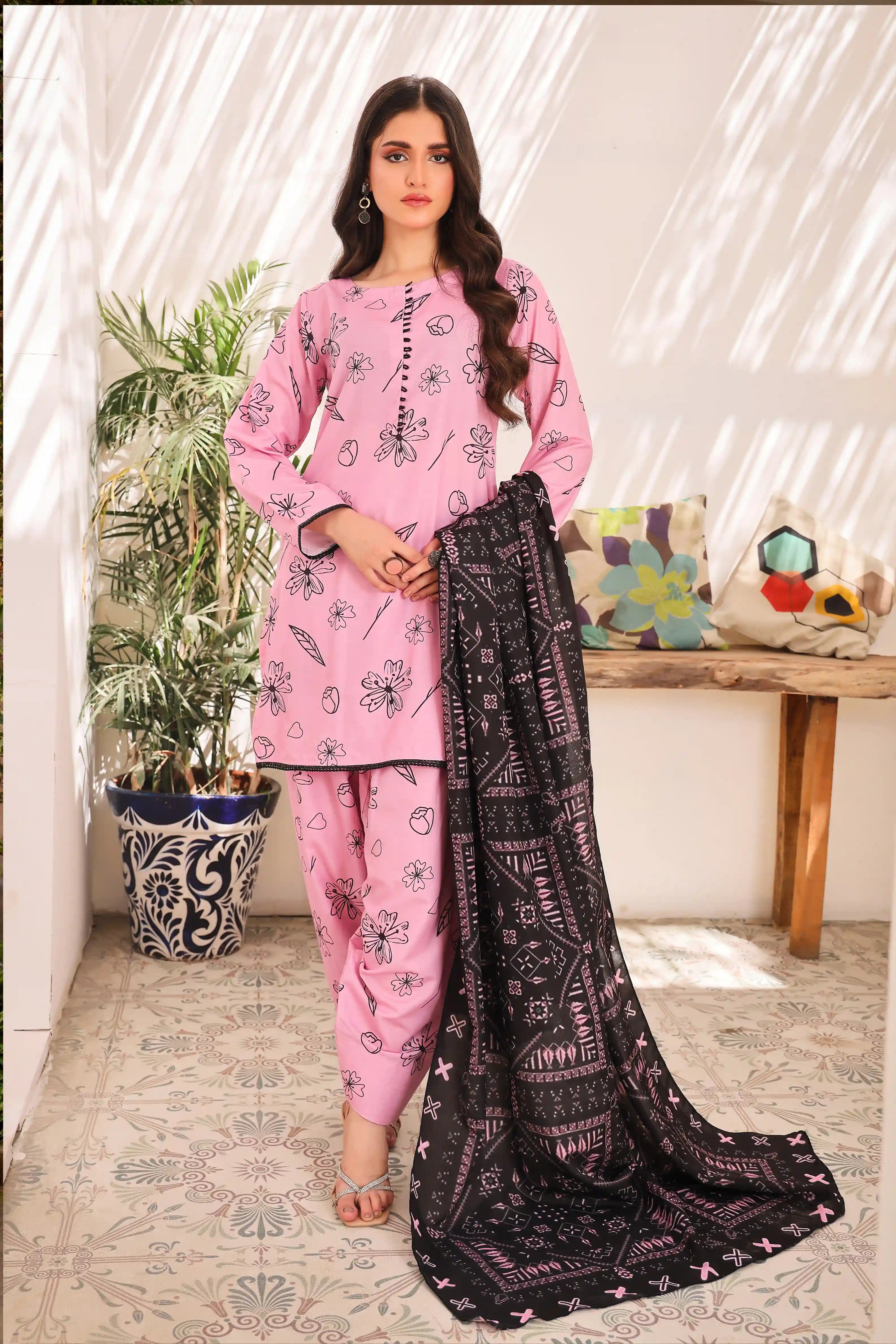 Introducing Soft Bloom – a premium Swiss Lawn ensemble featuring a delicate pink base adorned with an all-over floral print. Paired with a contrasting black printed lawn dupatta, this outfit is perfect for a refined and elegant look.