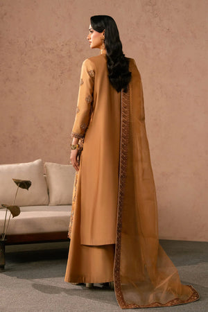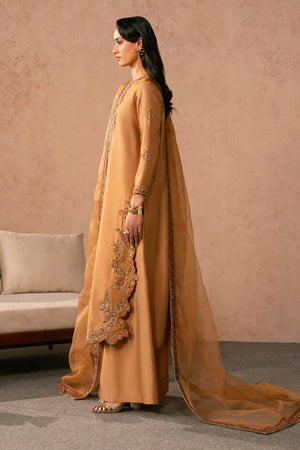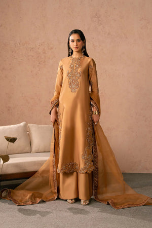 - It is paired with matching wide-leg trousers in the same hue, creating a seamless and elongated silhouette. Completing the outfit is a sheer organza dupatta , softly draped and flowing onto the floor, adding drama and refinement.