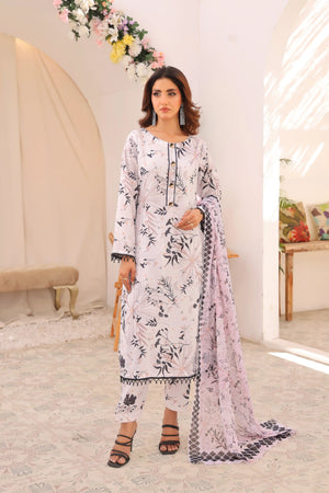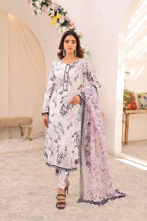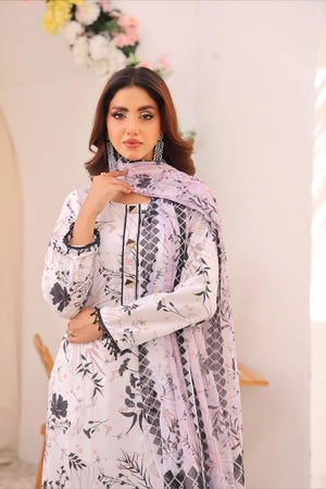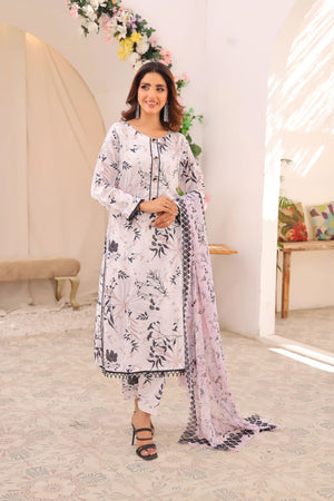 Discover Stellar Vision. Swiss Lawn with a white base, floral prints, and petal-detailed trousers. Paired with a soft silk dupatta with colorful floral borders. Perfect for a stunning summer look!
