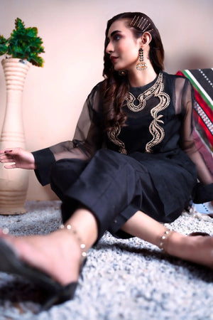 Introducing our latest creation - pure craftsmanship is depicted on this deep black portrait where Tilla work in a golden shade strikes its impact. Boat shape neck is given to keep an ethnic flavour. This is surely a timeless number and will be in vogue. Gota work is included to enhance the beauty and to make it a statement dress.