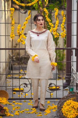 Immerse your senses - while we take you on an ethnic journey where there are clues to sparkling mirrors and beautiful embroidery to compliment it. This design is dedicated to the beauty in simplicity and elegance. Feel the love and be mesmerised in the magic of mirror work, done to perfection by our artisans. Glorify your style and reinvent the fury by choosing our signature designer wear - on a Rose Beige base colour. The detailing on this, will have your heart.Type: 3 pc (slip included)