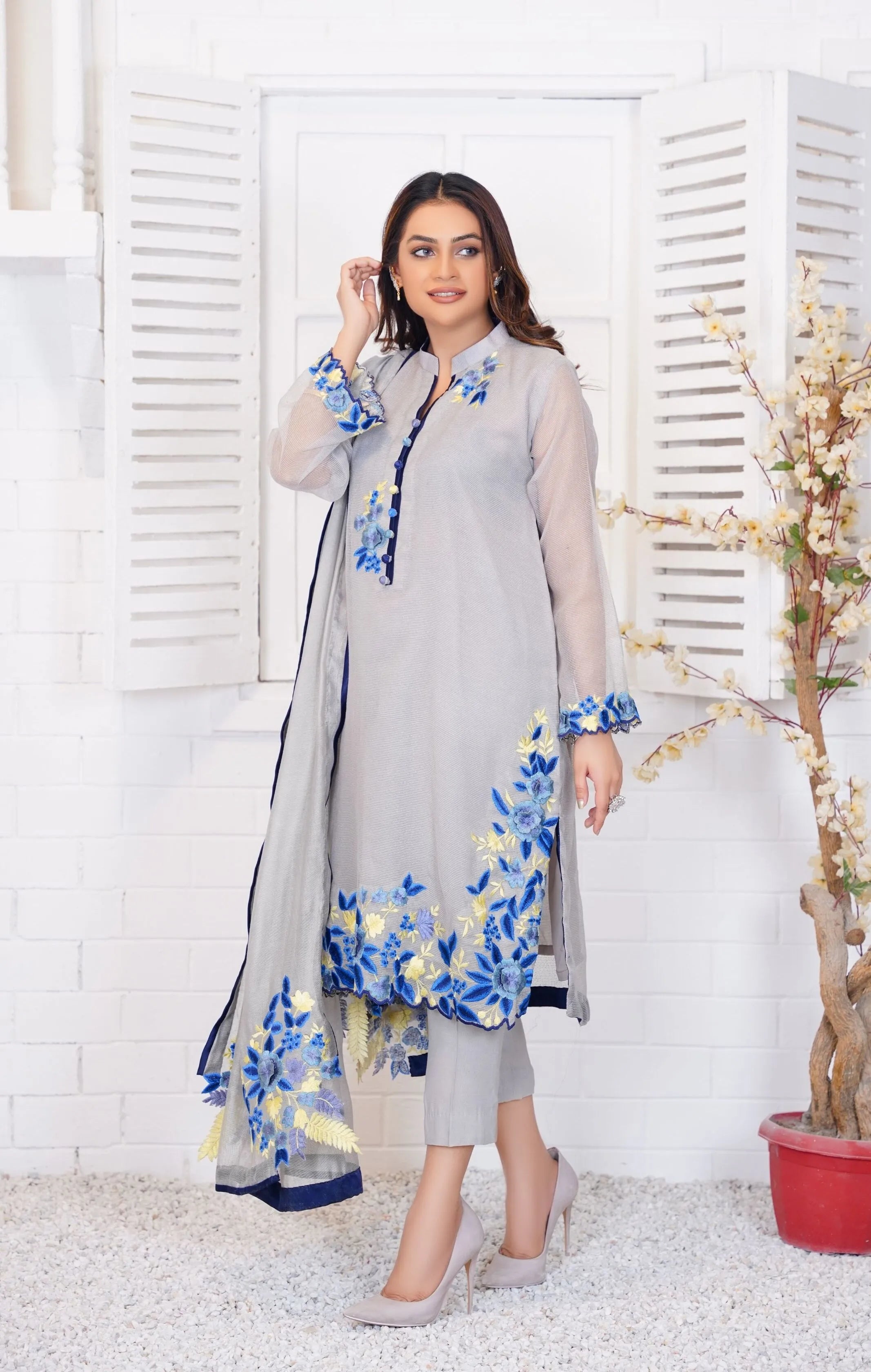 This outfit on textured organza is the perfect transition from winter to spring, with a pop of contrasting floral embroidery and 3D work. Complement it with matching trousers and an embroidered dupatta.