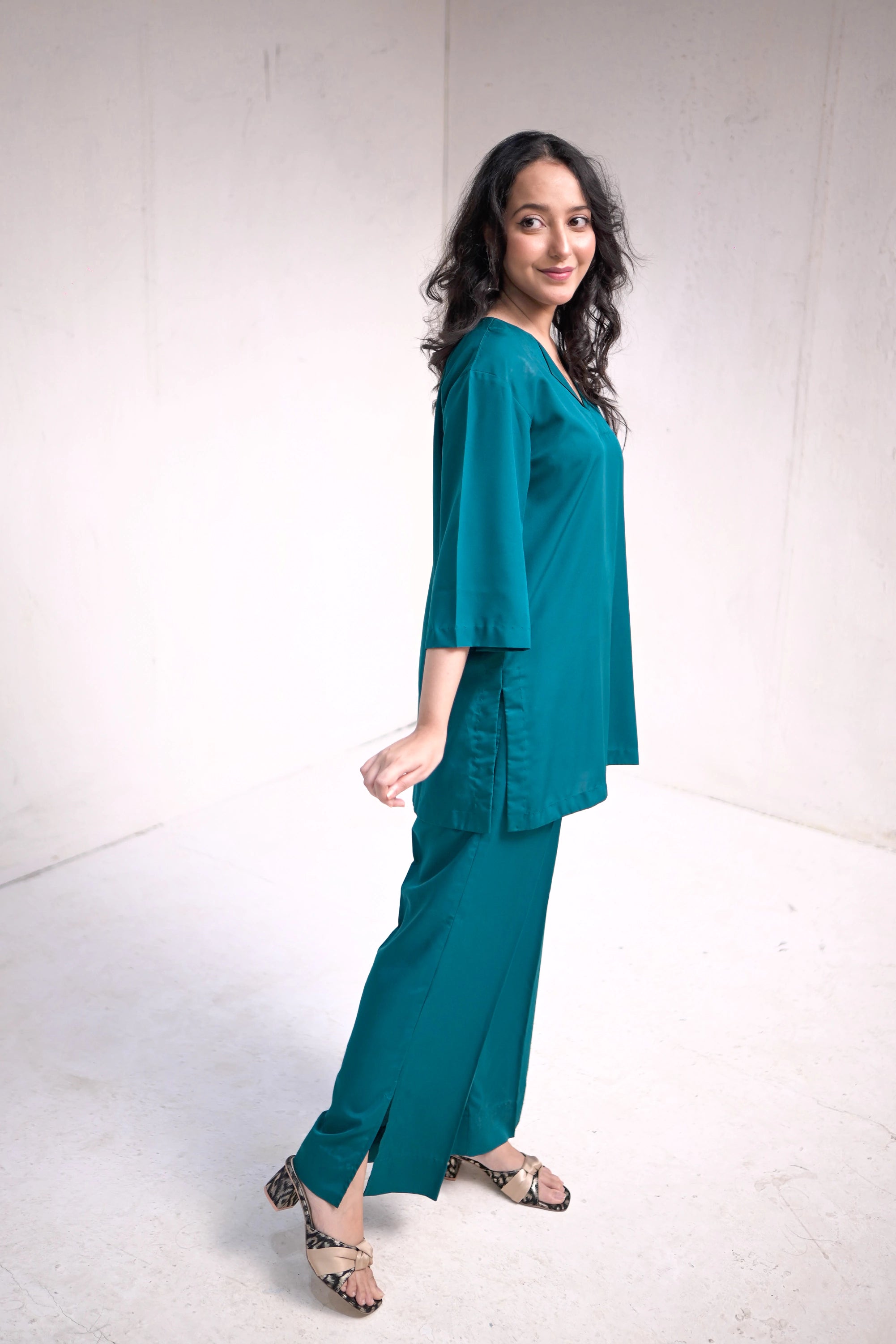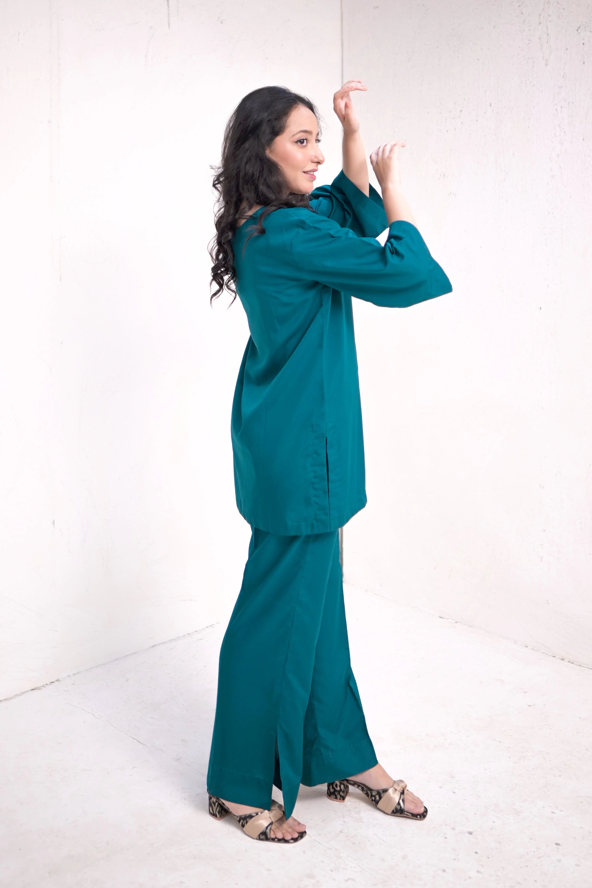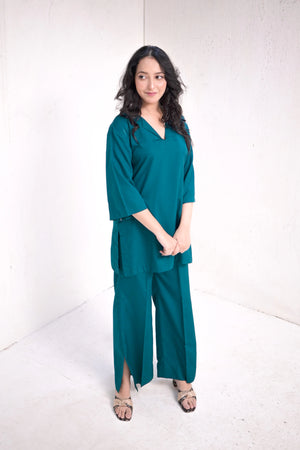 It’s a two piece malai georgette matching set includes a shirt with V-neckline along with cullote..