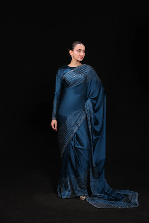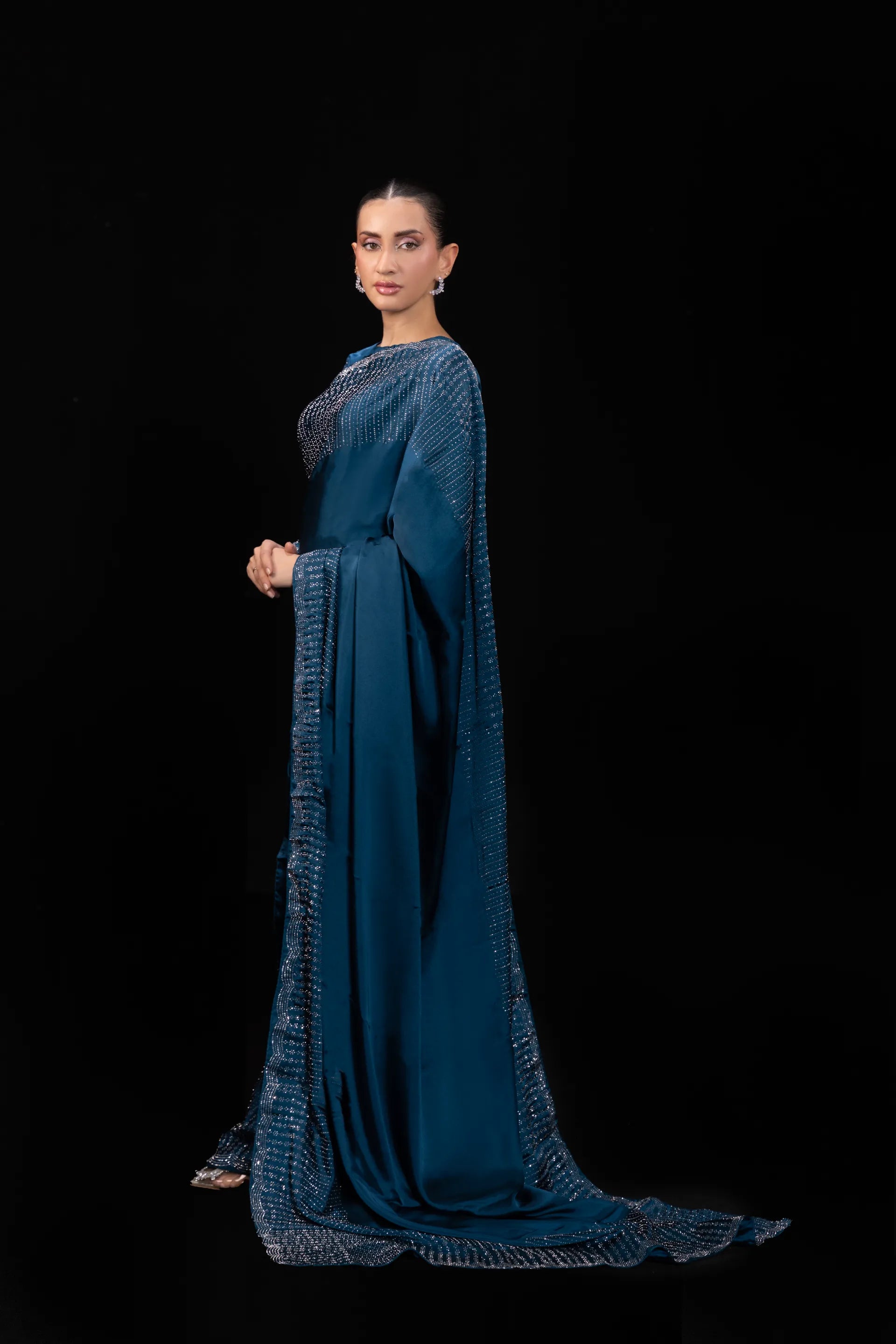 Teal Temptation channels bold elegance with a deep jewel tone palette and all over rhinestone embellishment. The luminous silk drapes like liquid over the skin, while the blouse features a contemporary cut that enhances the neckline and adds an unexpected twist at the back.