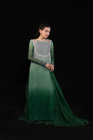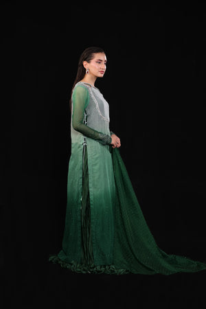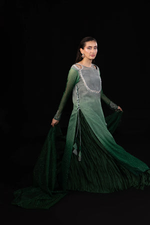 The Trendsetter is a celebration of color and craftsmanship. Featuring an ombre chiffon shirt that transitions from light to deep green, adorned with shimmering rhinestones, this set pairs with a crushed lehenga & blouse. The neckline is embellished with stones and subtle cutouts. The 3 yard chiffon dupatta with rhinestone work completes the look making this four piece ensemble perfect for the festive season.