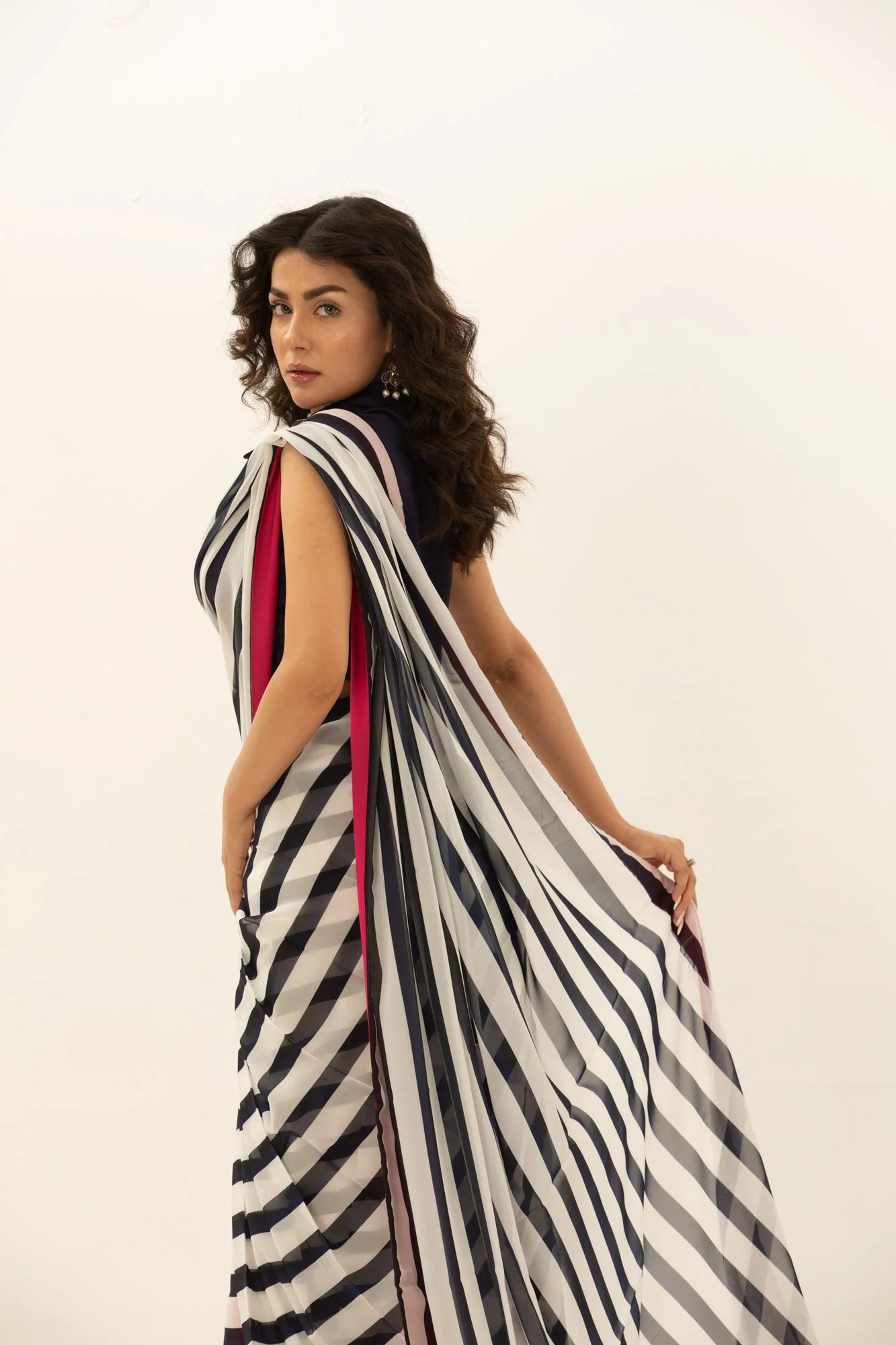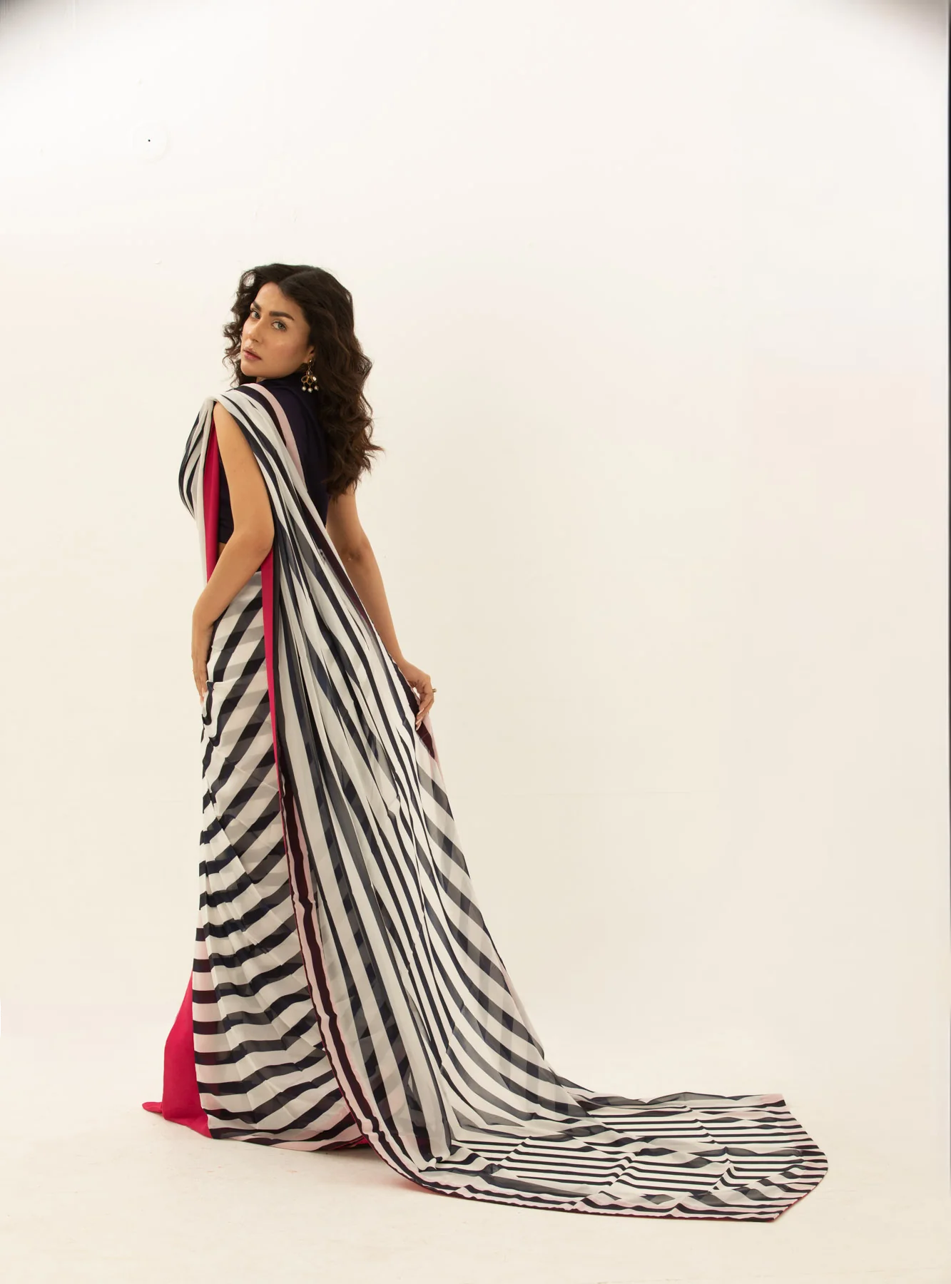Enjoy a classic saree fit with a modern twist—this chic blue and white striped saree is made from soft georgette chiffon fabric. The elegant pink accents give it a unique look, blending classic and contemporary styles effortlessly. The saree comes with a matching black silk blouse adorned with intricate adda work, adding to its overall sophistication. You can also customize the blouse with sleeves for a more personalized touch.