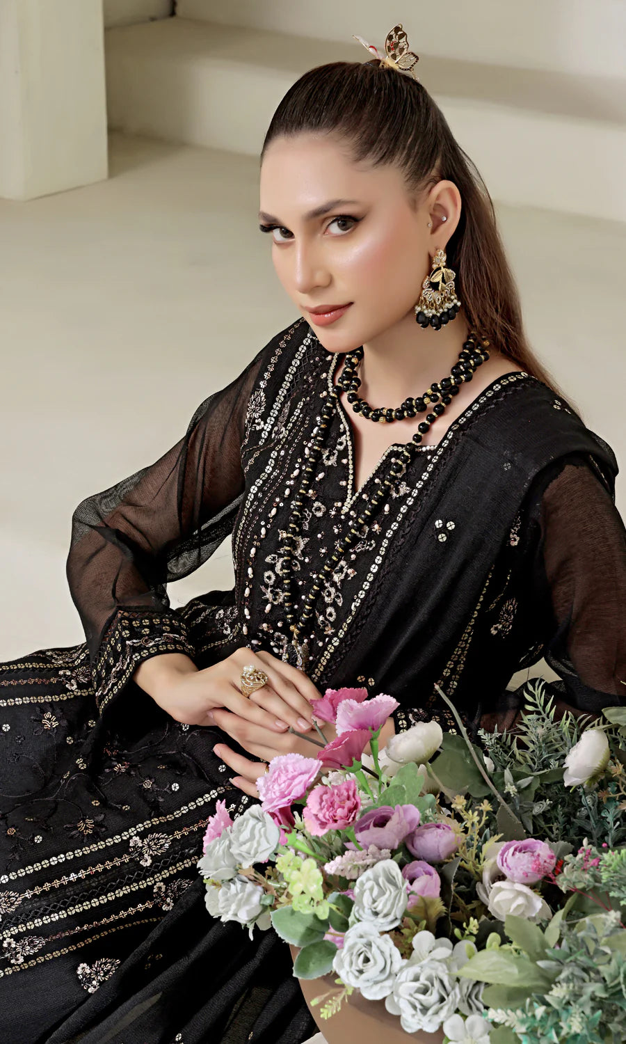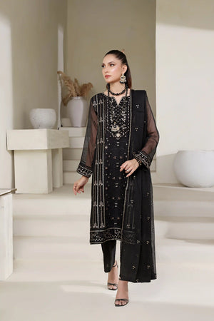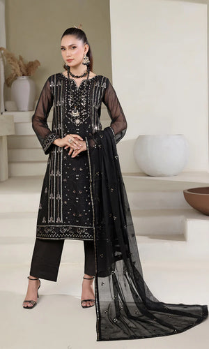 Details: This Black timeless beauty, with shimmering gold zardozi work, stones, and dabka work matched on Cotton Net. The ensemble comprises a delicate yet lavishly embroidered dupatta to make your wardrobe more elegance.