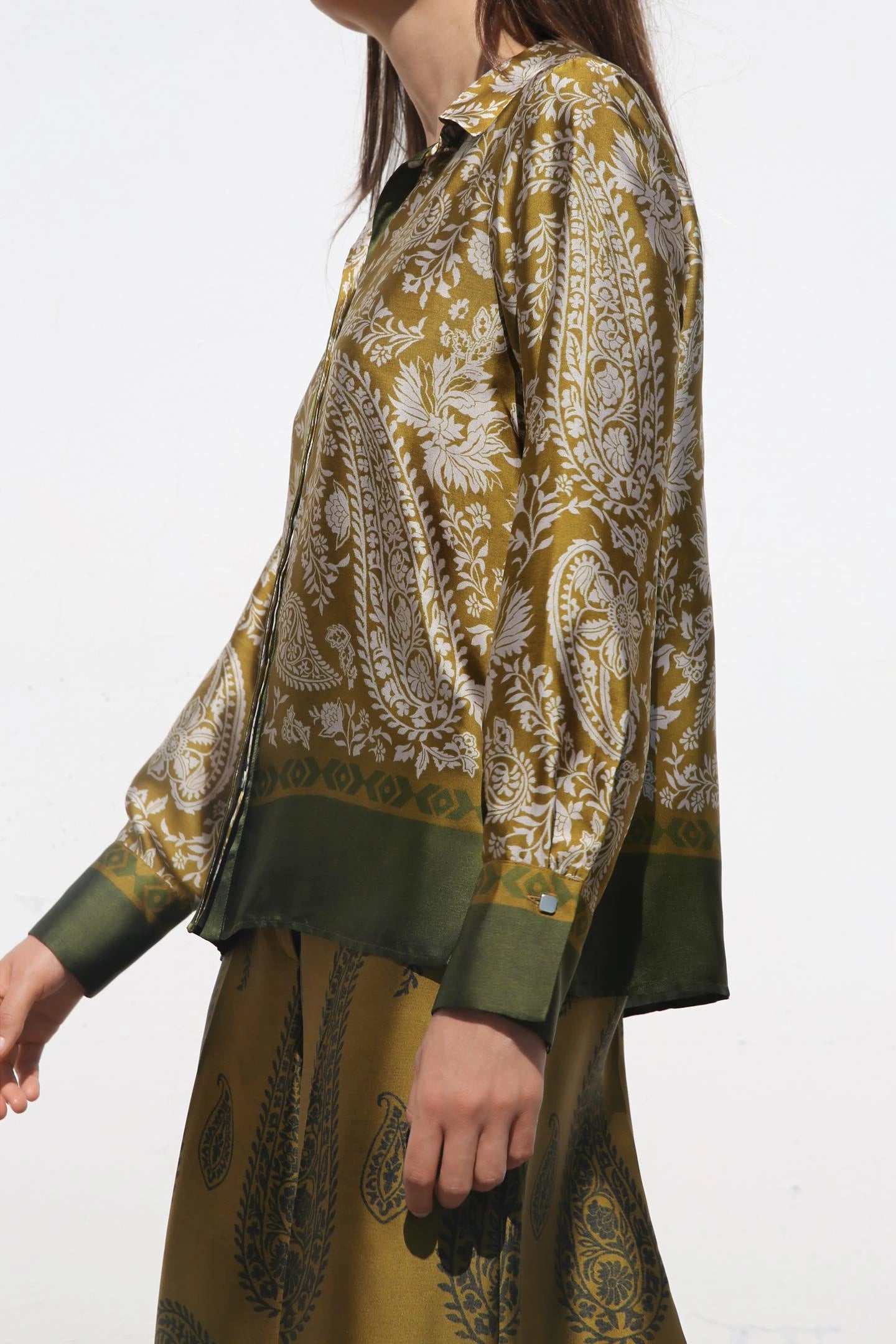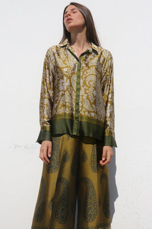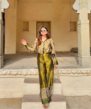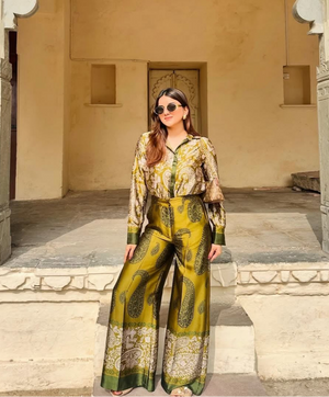 Elevate your wardrobe with this refined silk shirt and trouser, designed for both style and sophistication. Featuring a sleek collar and long sleeves with tailored cuffs, it exudes a polished and timeless appeal. The hidden button front with a smooth placket adds a minimalist touch, ensuring a flawless finish. Crafted from luxurious silk, this co ord set offers a silky texture and a lustrous sheen, making it perfect for both formal and casual occasions.
