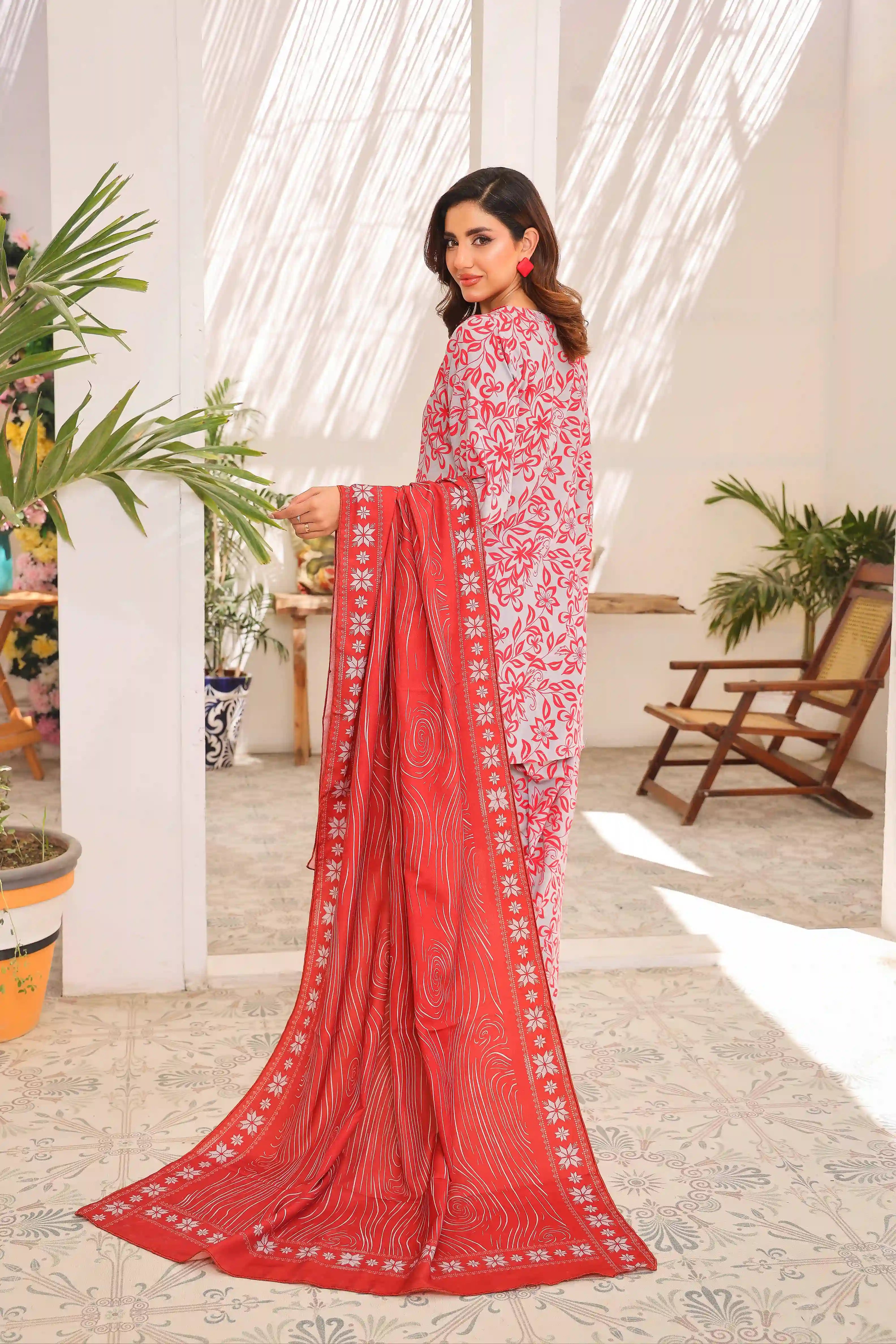 Introducing Verdant Muse – a premium Swiss Lawn ensemble featuring a delicate pink base adorned with an all-over floral print. Paired with a contrasting printed lawn dupatta, this outfit is perfect for a refined and elegant look.