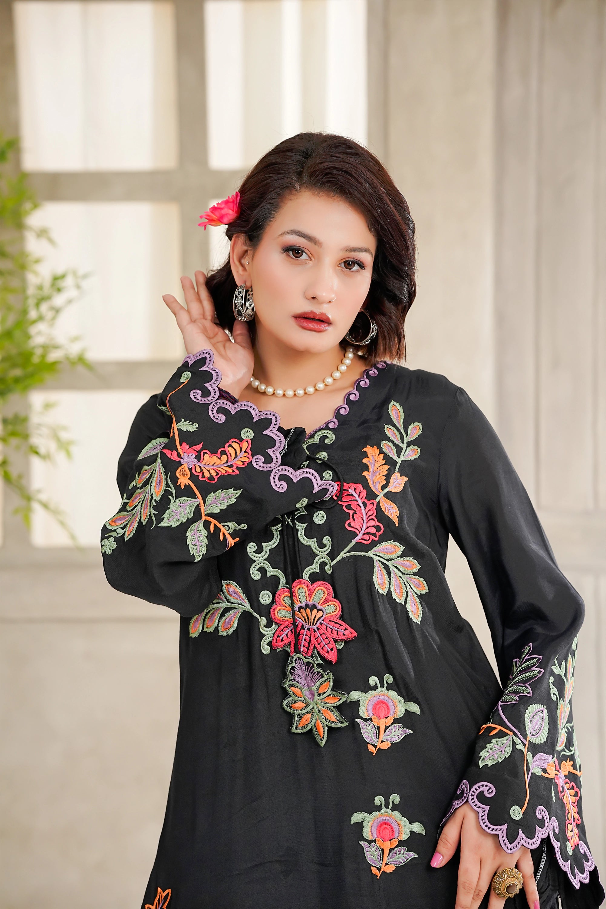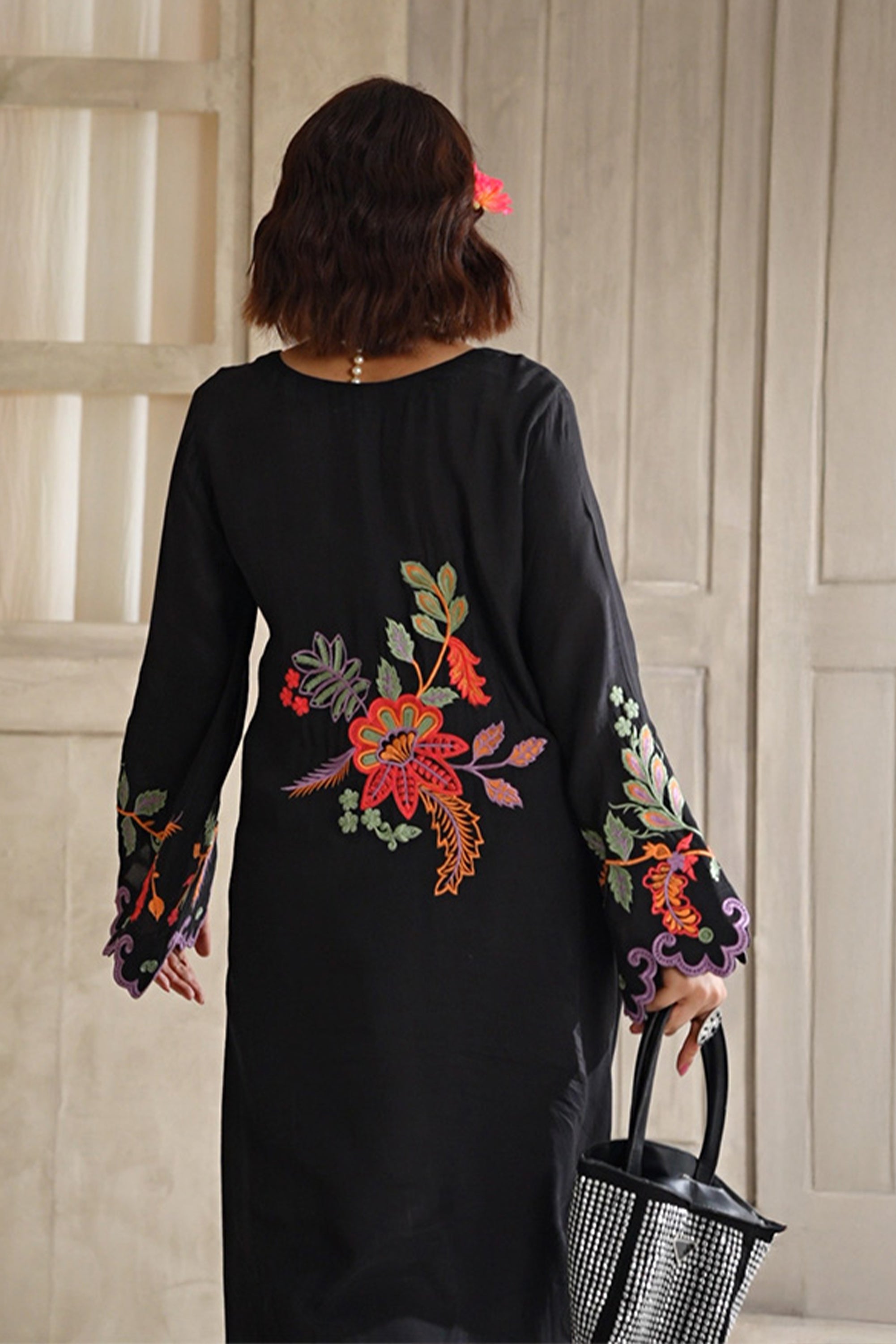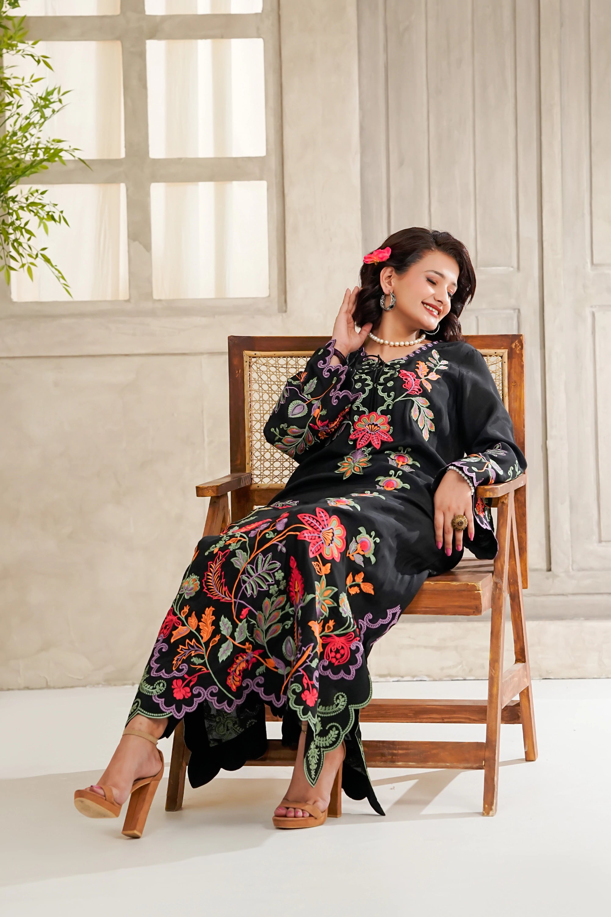 Step into vibrant elegance with this dramatic two-piece set. A flowing black shirt serves as the canvas for a rich tapestry of multicolored floral and botanical embroidery. Hues of fiery red, magenta, orange, and lime green cascade down the silhouette, complemented by an embroidered back and a chic scalloped hem. The matching solid black trousers complete this vivid and festive look.