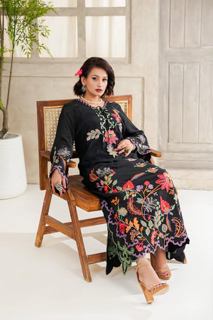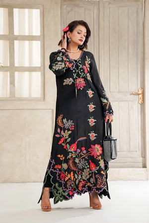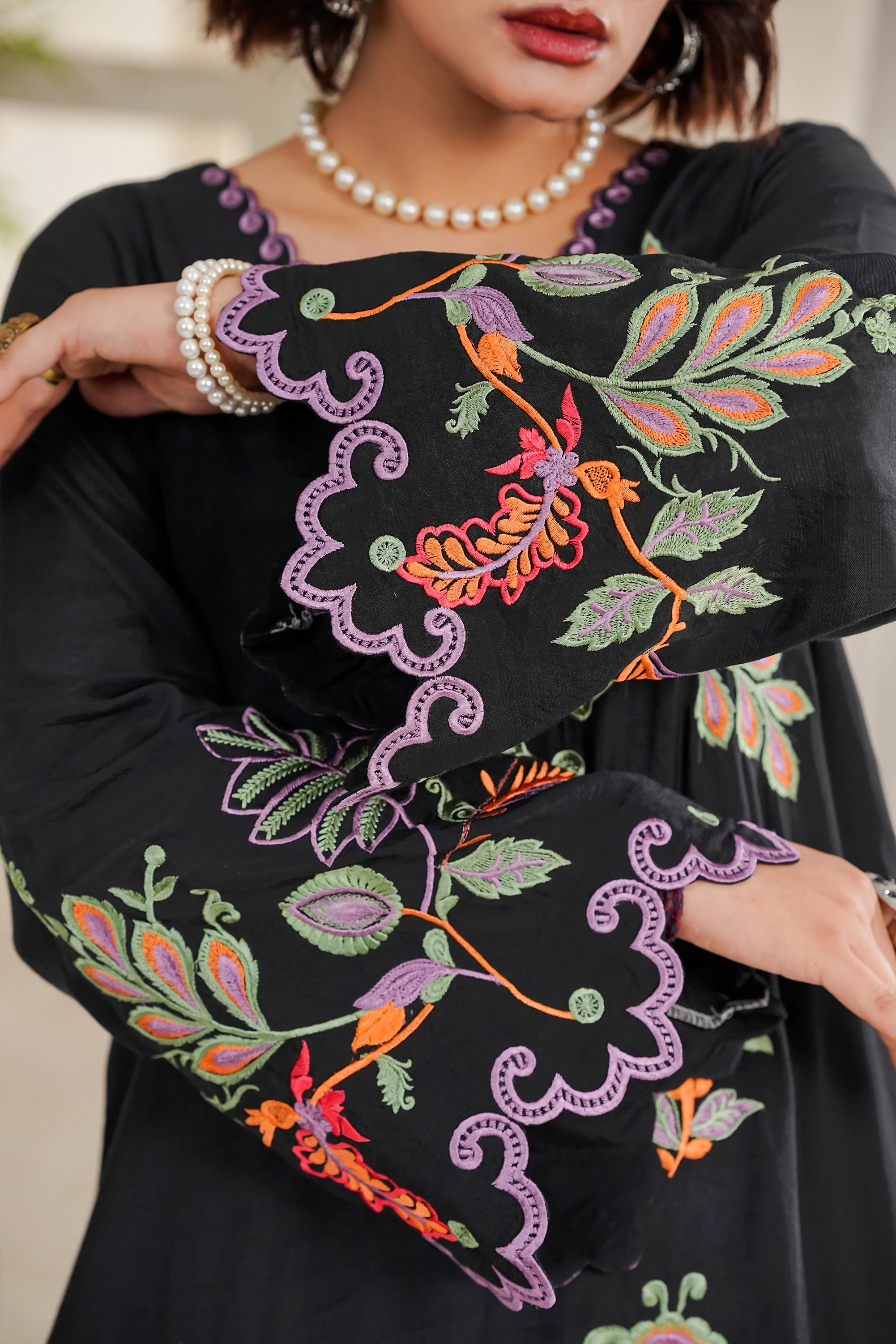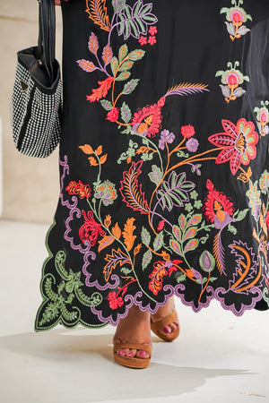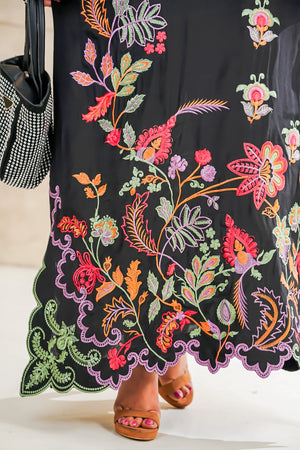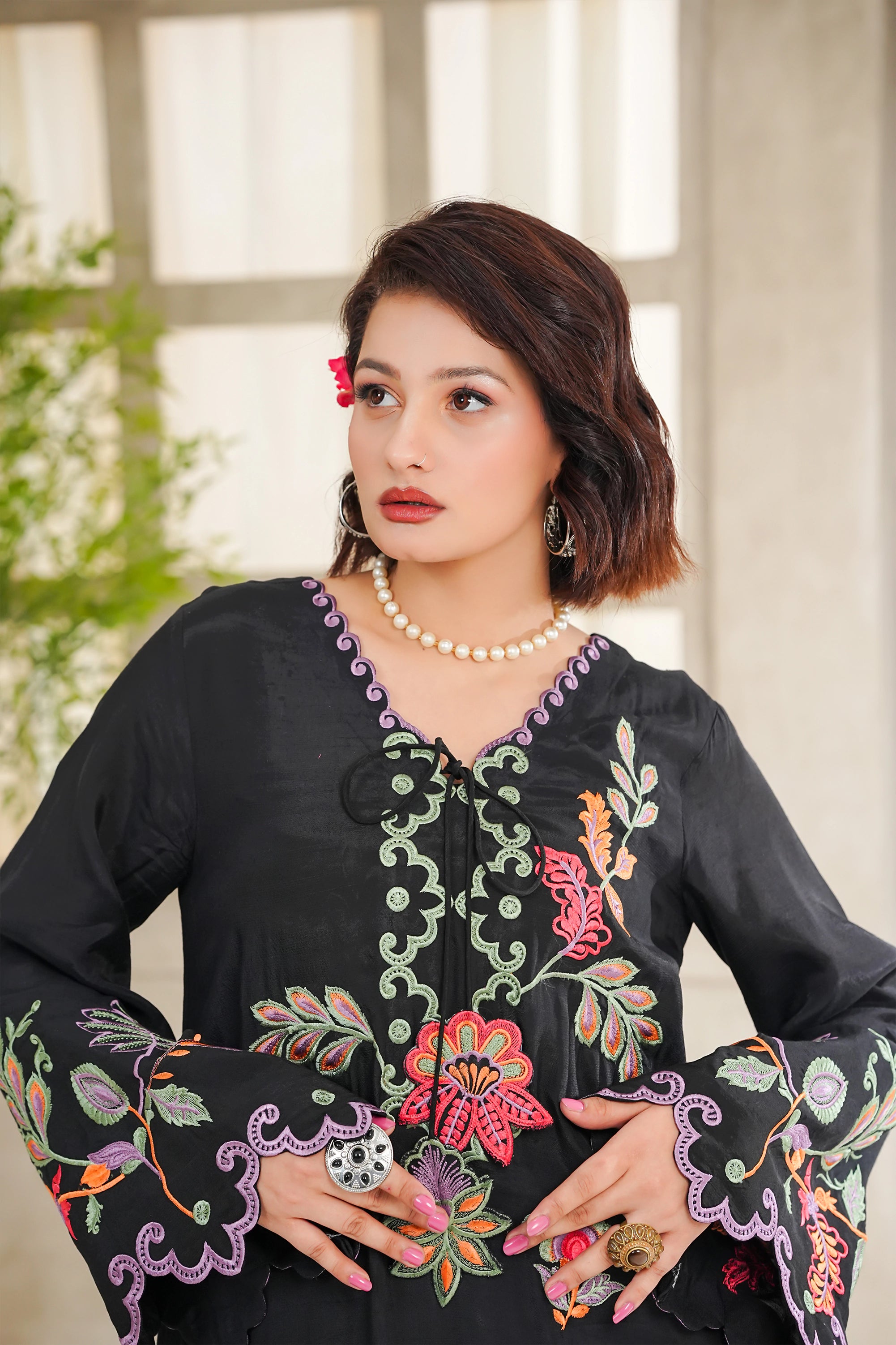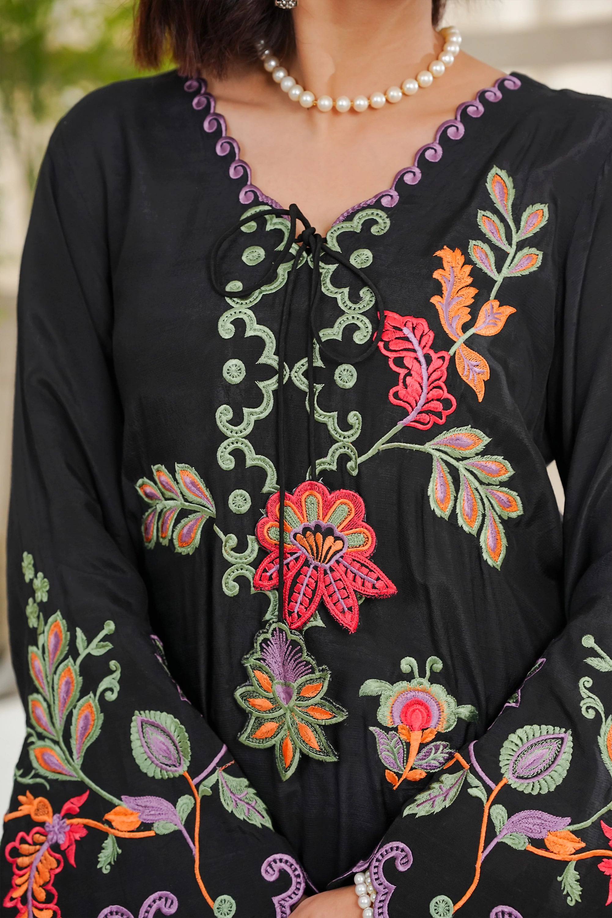 Step into vibrant elegance with this dramatic two-piece set. A flowing black shirt serves as the canvas for a rich tapestry of multicolored floral and botanical embroidery. Hues of fiery red, magenta, orange, and lime green cascade down the silhouette, complemented by an embroidered back and a chic scalloped hem. The matching solid black trousers complete this vivid and festive look.
