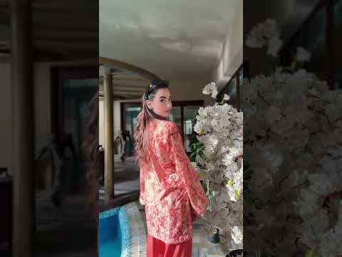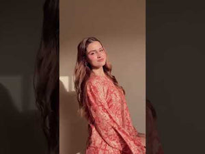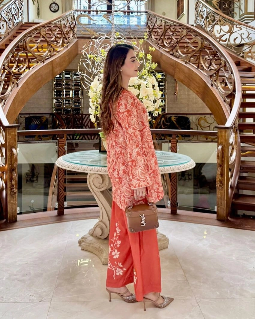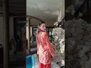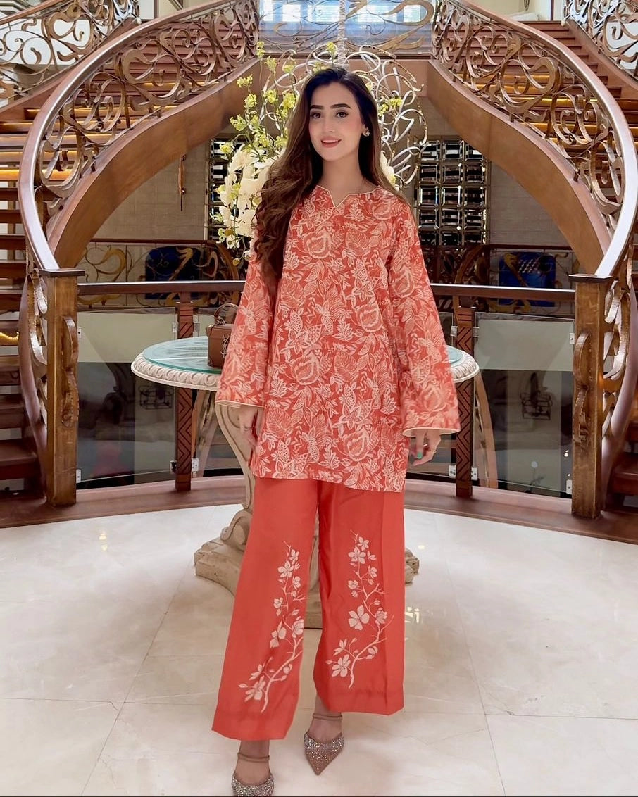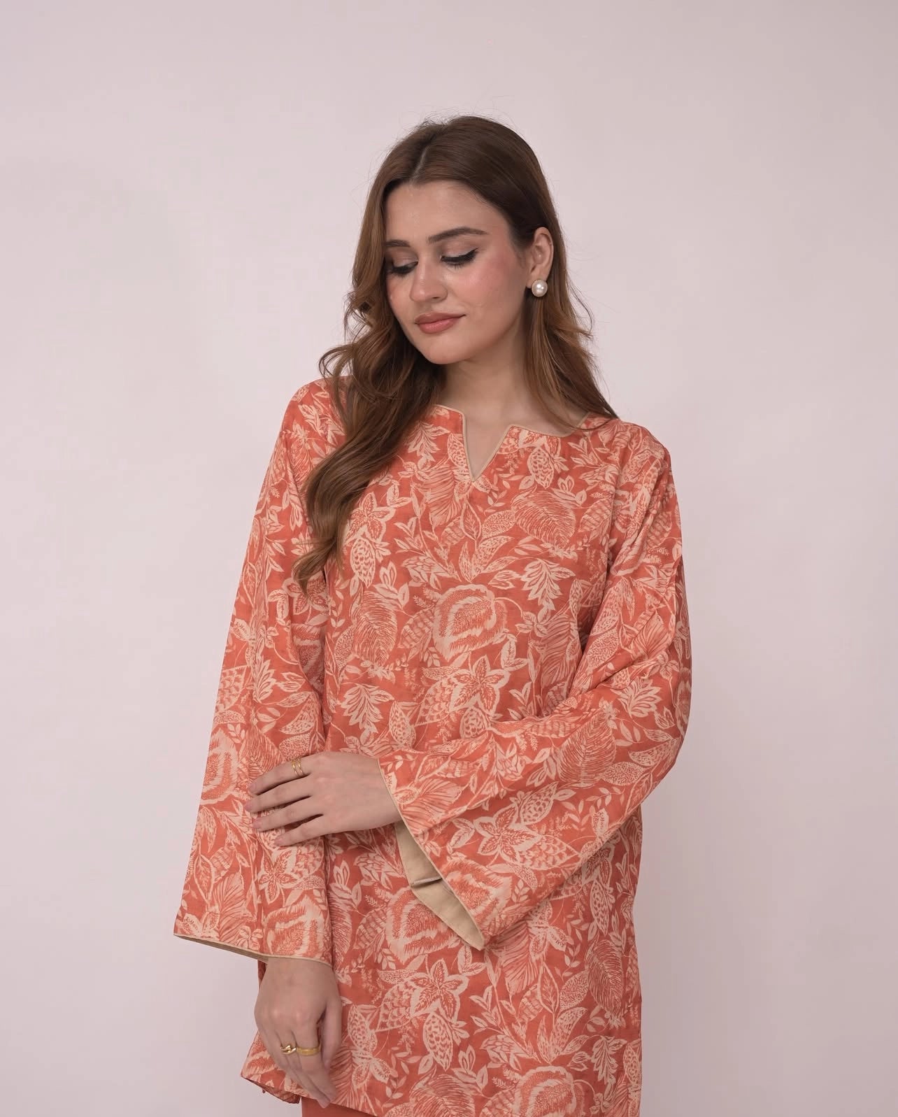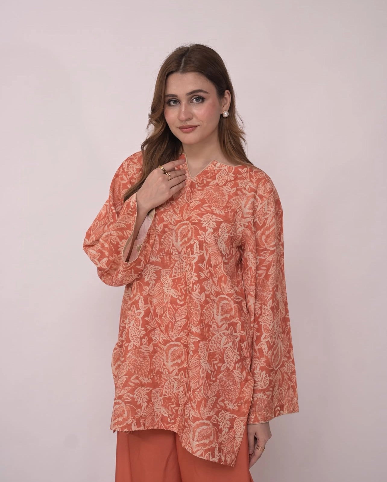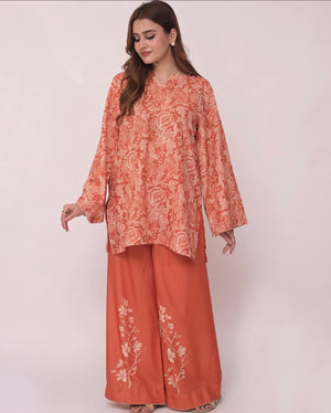 The printed shirt in soft tangerine hues is cut in a relaxed silhouette and elevated with beige piping along the neckline and sleeves for subtle detailing. The look is grounded with matching loose-fit pants, featuring graceful floral bunches printed near the hem, offering just the right amount of drama.