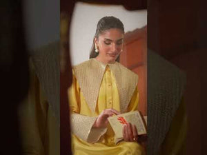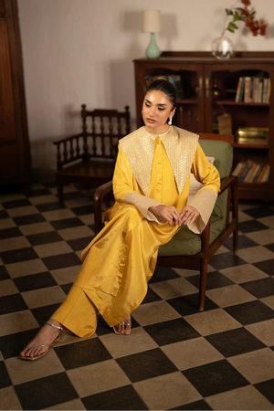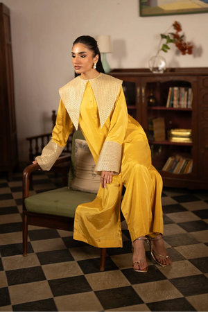 This bright yellow raw silk outfit features a long shirt with a beautifully embroidered, dramatic collar and delicate buttons on the front. The sleeves carry subtle embroidery, adding a graceful finish to the look. It is paired with loose raw silk pants, making it a comfortable and stylish choice for everyday wear or casual gatherings.