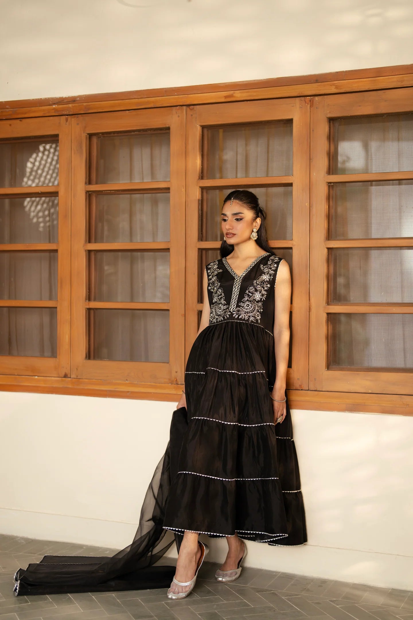Keep your everyday style effortlessly elegant with this black 3-layered dress crafted from premium raw silk. Designed for comfort and simplicity, the dress features subtle neck embroidery enhanced with gota details, adding just the right touch of charm without overpowering the look.The outfit comes with a matching black trouser, making it an easy, ready-to-wear choice for casual outings, workdays, or basic semi-formal gatherings.