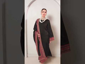 Elevate your formal wardrobe with this luxurious 3-piece ensemble crafted from premium shamooz silk, designed to make a timeless statement. The long black shirt features exquisite hand embellishments with intricate threadwork, delicate sequins, adding a refined sparkle that catches the light with every movement.