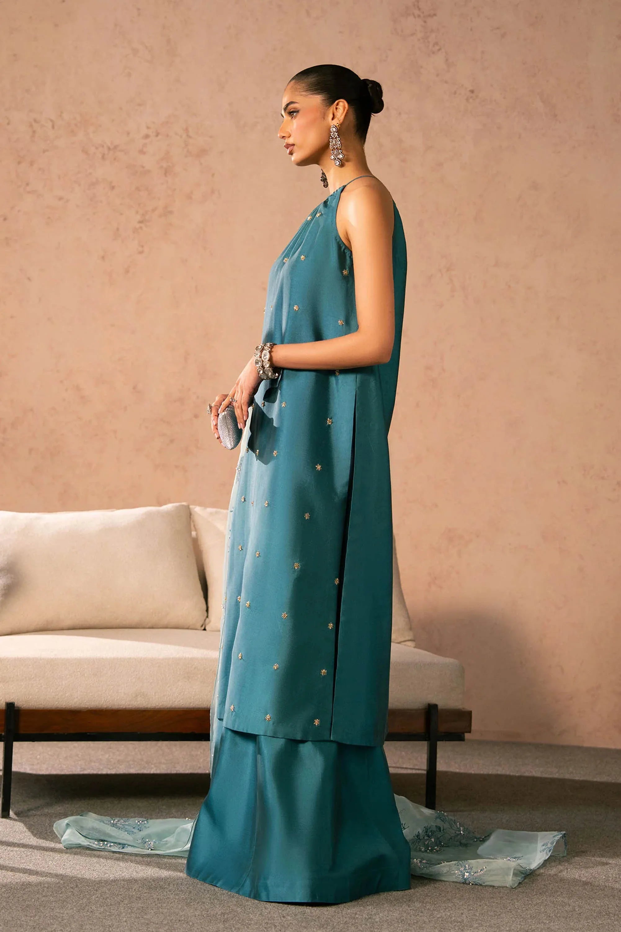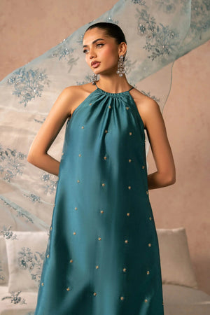 - Completing the ensemble is a sheer, mint-toned organza dupatta adorned with intricate floral embroidery and fine detailing along the borders. Light and airy, it adds contrast and softness to the deeper teal base, elevating the overall look.